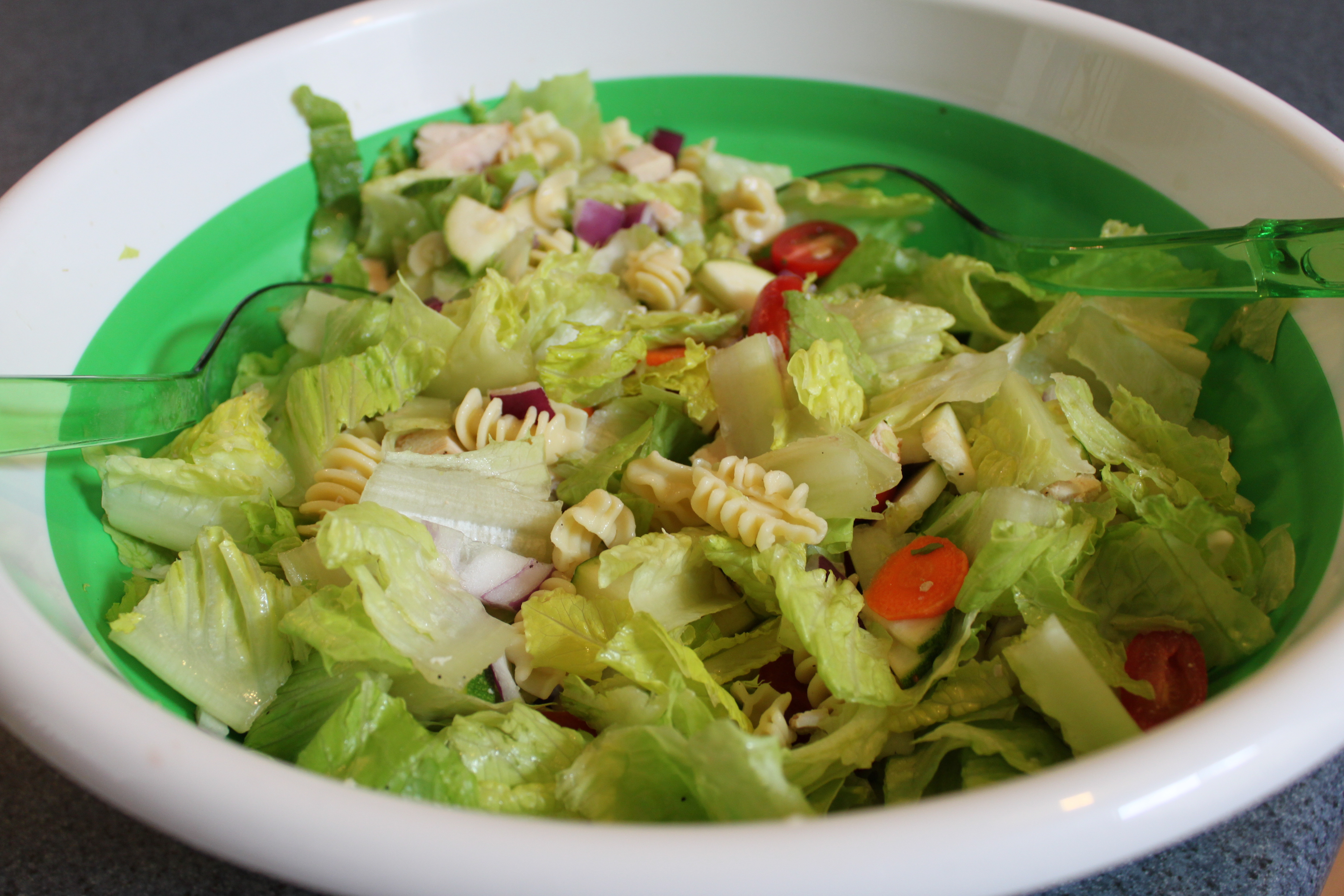 Cook pasta according to package directions. Drain and rinse under cold water and put in large serving bowl. Thinly slice lettuce (using a metal knife will make the lettuce turn brown so if you have a knife that is not metal, that’s the one to use) and dice chicken. Slice red onion, squash and tomatoes. Cut carrot into julienne strips. Slice olives. Top pasta with all ingredients. Drizzle with dressing and toss.