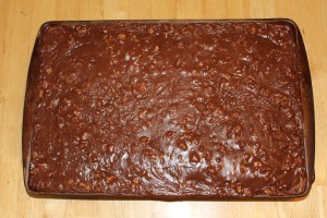 To make cake, combine dry ingredients and mix well. Bring water and butter to a boil then pour over dry ingredients and mix well. Beat in buttermilk, eggs and vanilla. Pour batter (it will be thin) into a greased and floured 15 x 10″ pan. Bake at 400 for 20 minutes.