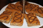 2 Place caramels and cream in microwave safe bowl and microwave, uncovered, on high 1 – 3 minutes or until melted and smooth, stirring every 30 seconds. Pour over hot crust, carefully spreading to edges. Let stand 10 minutes or until caramel is set then cut lengthwise into 8 rows.