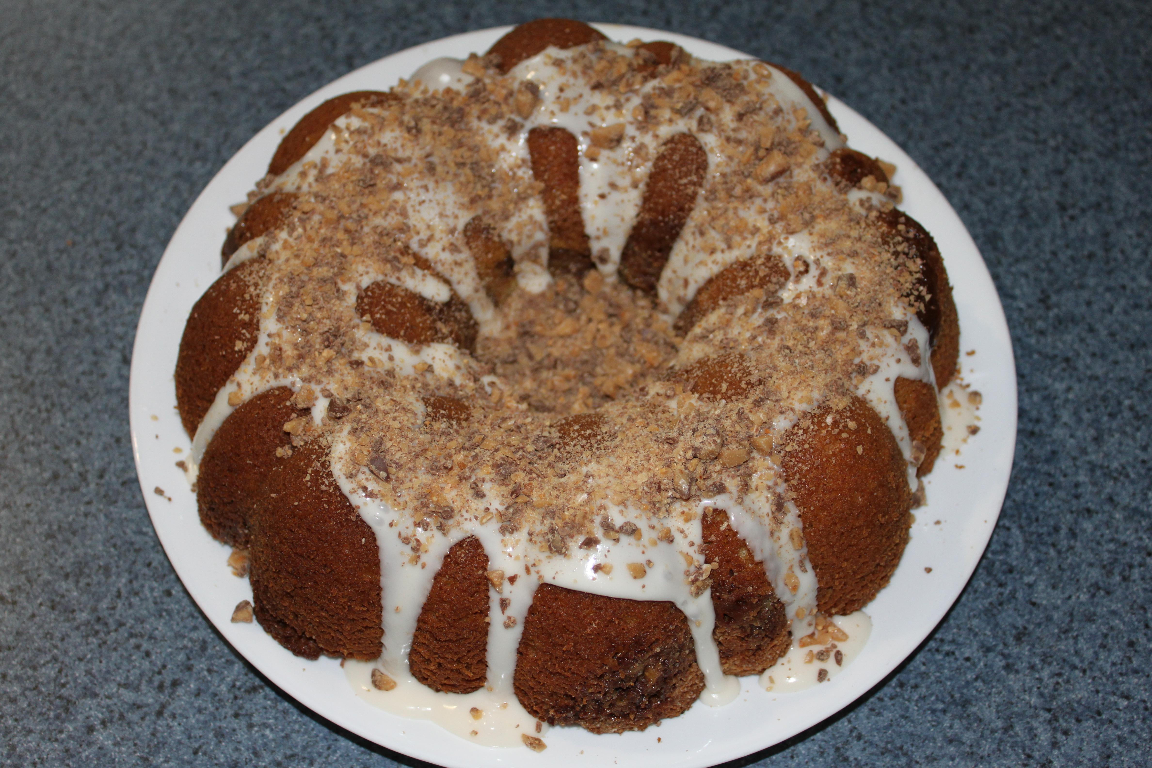 1 Heat oven to 350. Grease and flour 12 cup fluted tube pan or 10″ tube pan (I chose to use my bundt pan). Set aside 1/4 cup toffee bits for topping. Combine remaining toffee bits, 1/4 cup sugar, walnuts and cinnamon.