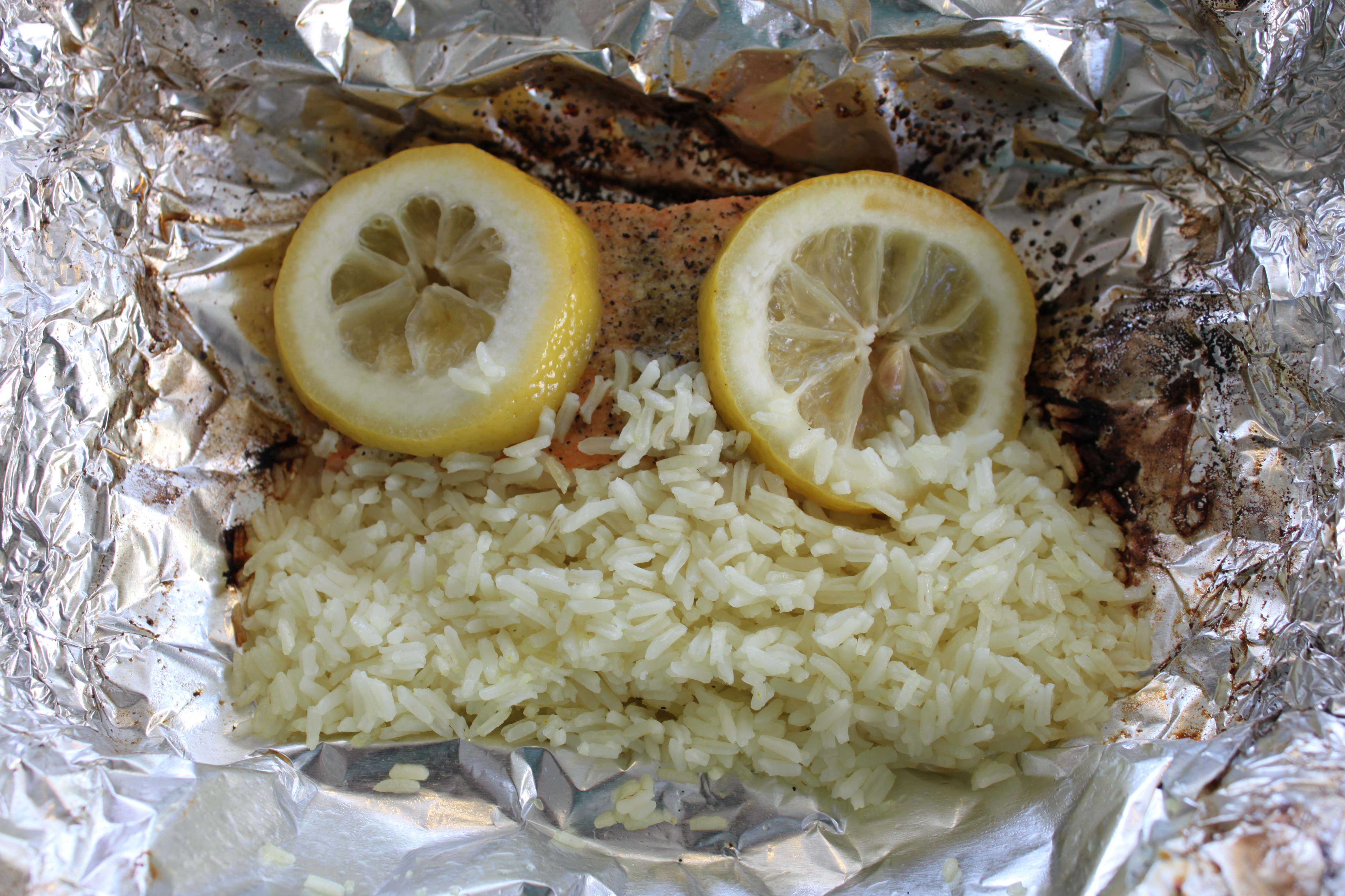 Heat coals or gas grill.  Spray 4 18 x 12″ sheets of heavy duty aluminum foil with cooking spray.  Mix rice and broth in bowl and let stand 5 minutes or until most of the broth is absorbed.  Stir in carrots.  Place fillet on center of each piece of foil.  Sprinkle with lemon pepper and salt and top with chives.  Arrange lemon slices over fillet.  Spoon rice mixture around each fillet.  Fold foil over so edges meet.  Seal edges, making tight 1/2″ fold then fold again.  Allow space on sides for circulation and expansion.  Cover and grill 4 – 6″ from low heat 11 – 14 minutes or until salmon flakes easily with fork.  Cut large X across top of packets and fold back foil.