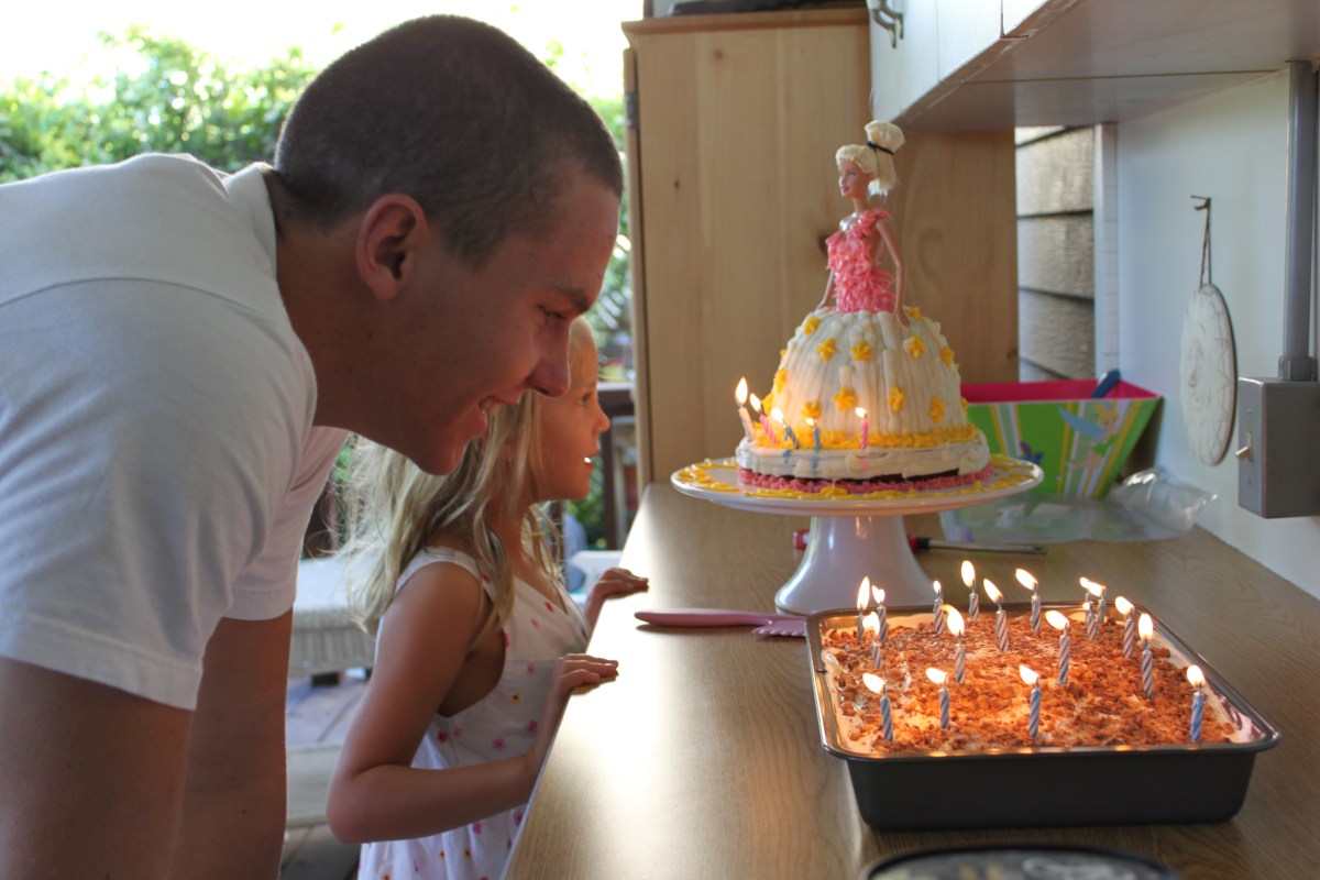 food blog 172 Published July 4, 2010 at 4752 × 3168 in Barbie Doll Cake/Basic Buttercream Icing Here are Wyett and Kate getting ready to blow out the candles!