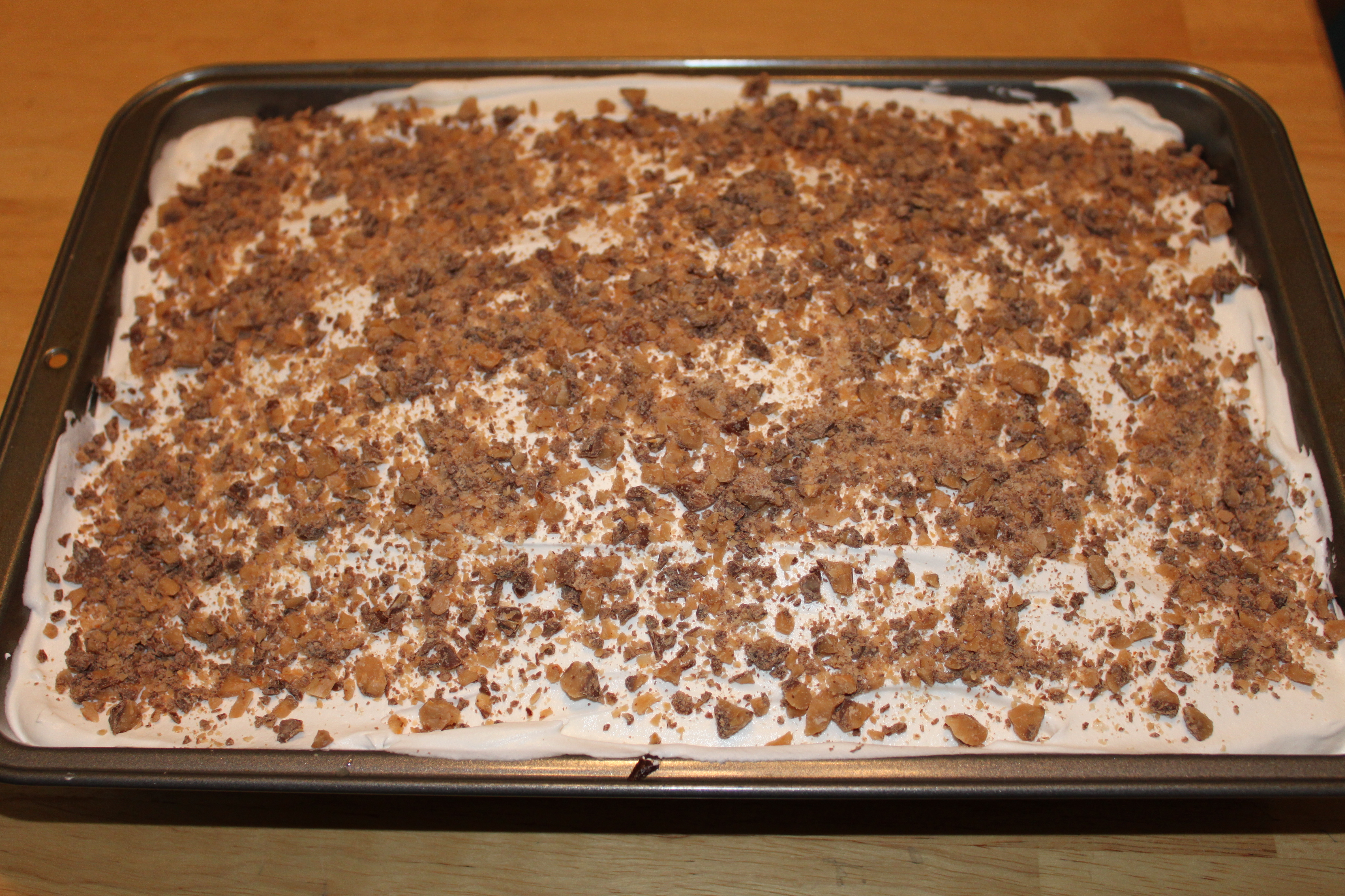 Heat oven to 350.  Grease bottom only of 13 x 9″ pan.  Make cake mix as directed.  Pour into pan and bake 30 -35 minutes or until toothpick inserted in center comes out clean.  Cool 15 minutes.  Poke top of cake every 1/2″ with handle of wooden spoon.  Drizzle milk over top of cake and let stand until milk is absorbed into cake.  Drizzle with topping.  (I combine the milk and topping and pour it over the cake at the same time.)  Run knife around side of pan to loosen cake.  Cover and refrigerate 2 hours or until chilled.  Spread Cool Whip over cake and sprinkle with toffee bits.    Store covered in fridge.