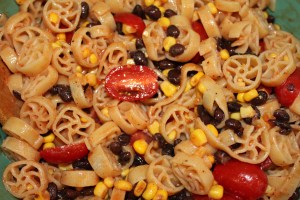 Cook pasta according to package directions, adding corn during last minute of cooking time (no need to do this if you used the canned corn like I did). Drain and rinse with cold water to cool. Combine dressing, tomato sauce, cilantro and chili powder; whisk until well blended. Combine past, corn, beans, tomatoes and dressing. Toss gently to coat.