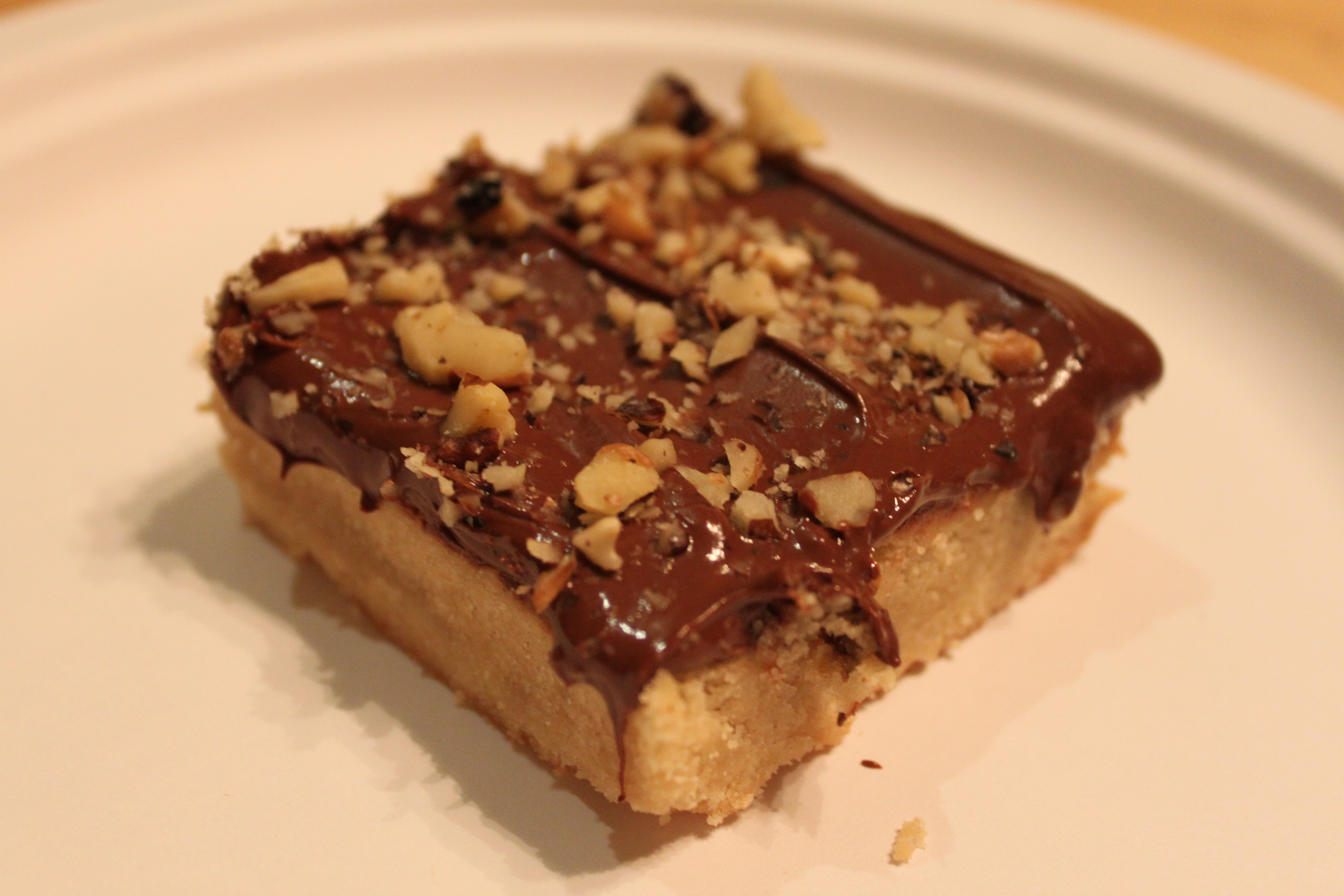 4 Remove from oven and immediately sprinkle chocolate on top of hot cookie base. Let stand until the chocolate softens, then spread evenly over the top with a spatula or palette knife. Sprinkle with chopped nuts.