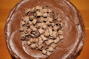 3 For frosting, melt semisweet chocolate in a heavy saucepan over medium heat. Gradually stir in cream until well blended. Heat to a gentle boil, boil and stir for 1 minute. Transfer to a large mixing bowl. Refrigerate for 2 – 3 hours or until mixture reaches a pudding like consistency, stirring occasionally. Beat until soft peaks form. (Just a note from me, this takes awhile so be patient.) Immediately spread between layers and over top and sides of cake. Sprinkle with grated chocolate. (I took my vegetable peeler and made curls by just running the peeler down the long side of the candy bar.) Store in refrigerator.
