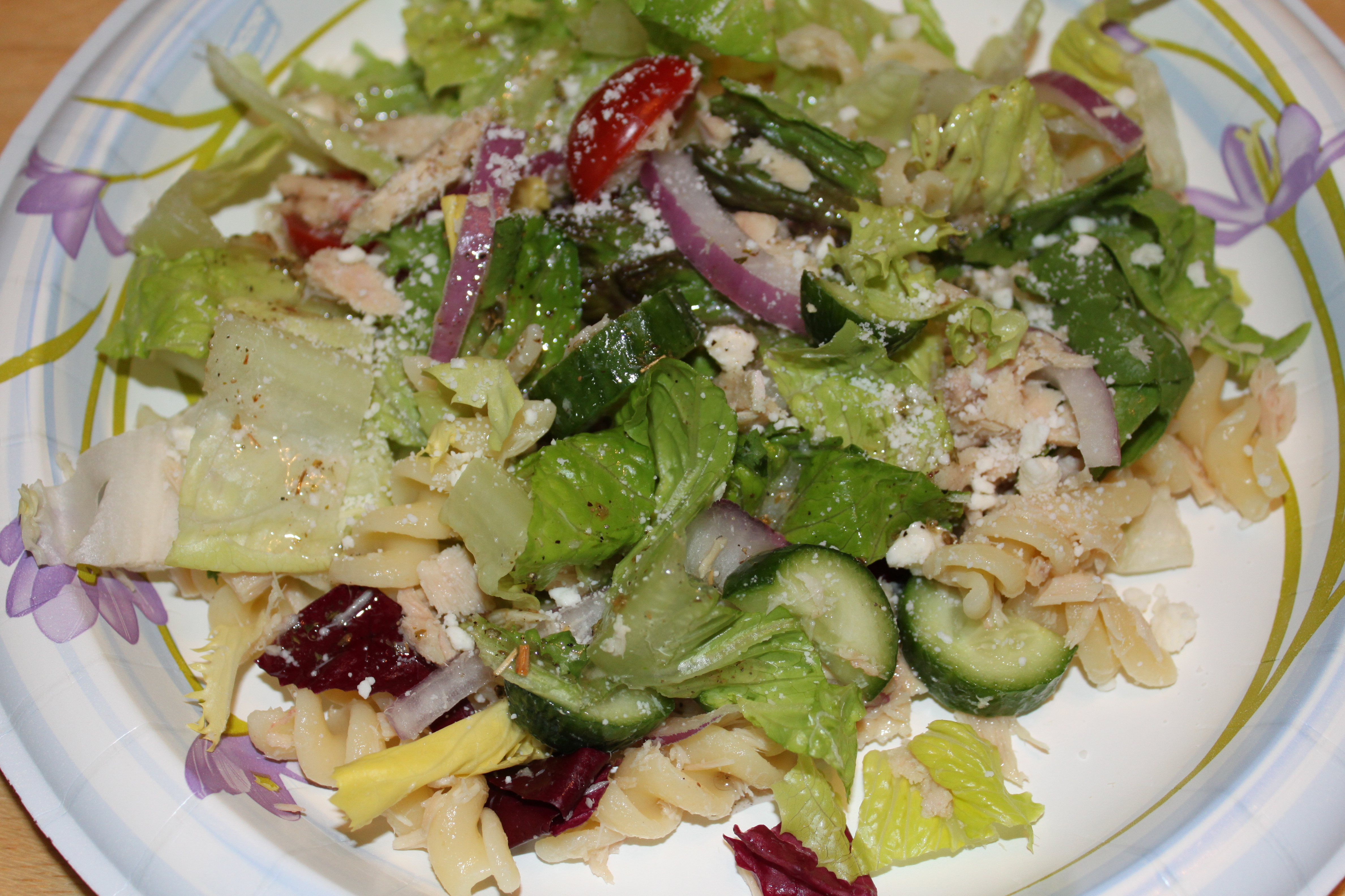 1 (8 oz) package Mediterranean salad blend (5 cups) (I bought a 9 oz package and then added about 1 1/2 heads of Romaine as well)