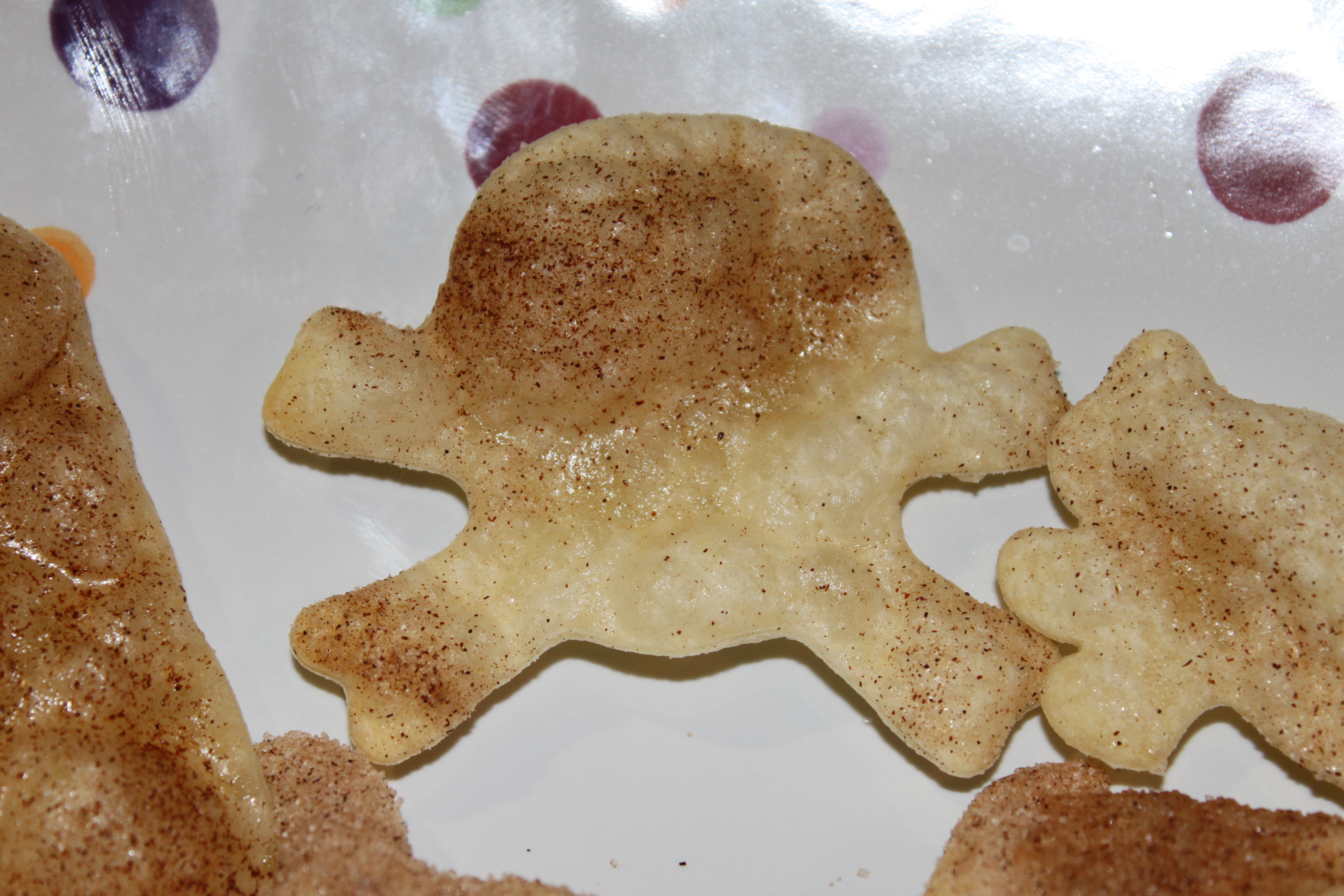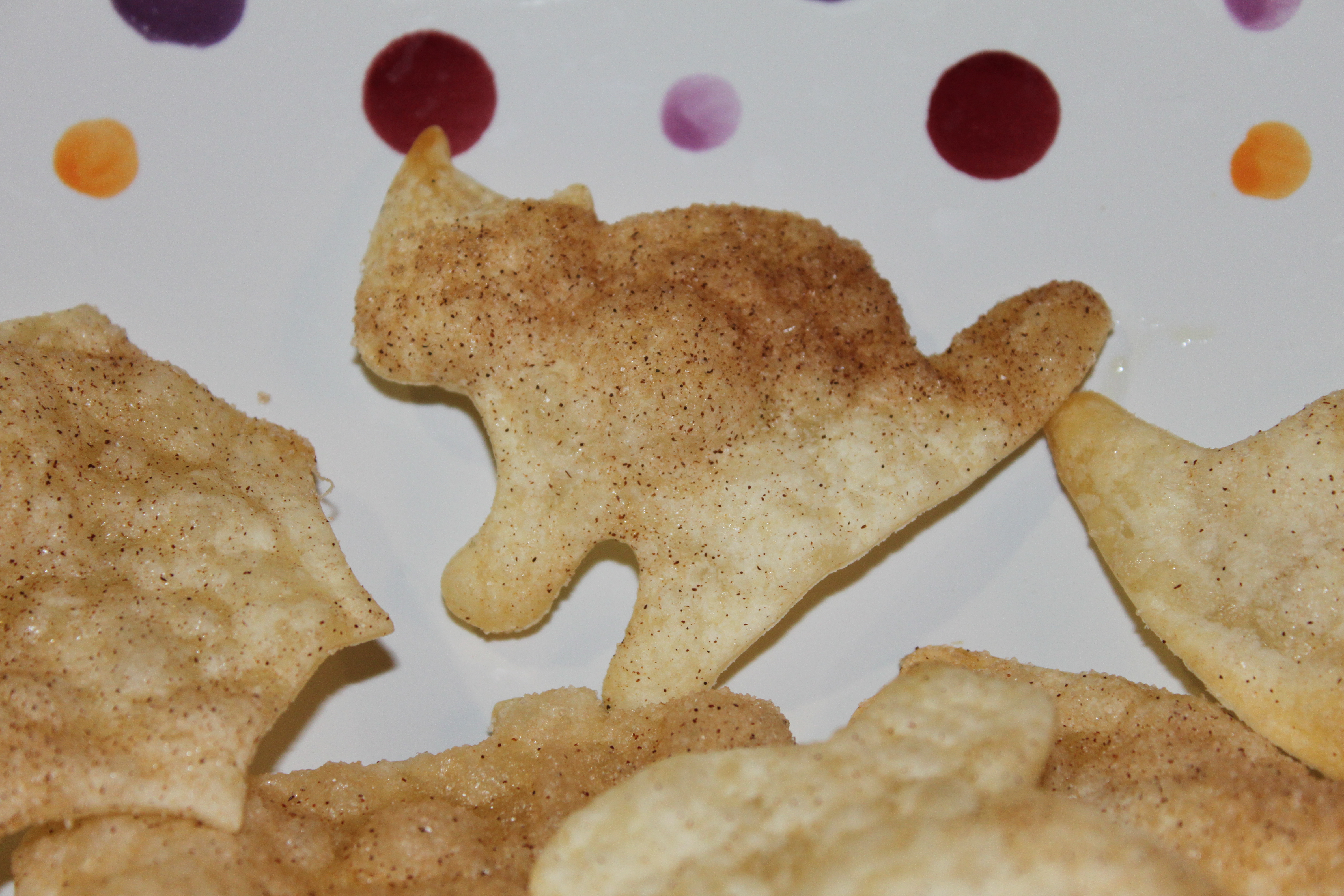Preheat oven to 350. Spray baking sheets or stones (stones are my preference) with cooking spray. Using Halloween shaped cookie cutters of any size of your choice, cut shapes out of tortillas and place on stones sprayed with cooking spray. When stone is full (do not overlap), spray all tortilla cutouts with cooking spray and then sprinkle liberally with cinnamon and sugar. Bake in oven for about 5 – 10 minutes or until tortillas start to puff up and brown slightly. (How easy is that?)