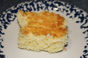 Mix all ingredients together. Bake in greased 9 x 9″ pan at 350 for 30 – 40 minutes.