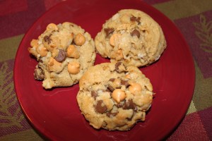 Preheat oven to 375. Combine flour, baking powder, baking soda and salt in small bowl. Beat butter, brown sugar, sugar and vanilla in large mixer bowl until creamy. Beat in egg. Gradually beat in flour mixture. Stir in morsels, coconut and nuts. Drop by slightly rounded tablespoons onto greased baking sheets. Bake for 8 – 11 minutes or until edges are lightly browned. Cool on baking sheets for 2 minutes then remove to wire racks to cool completely. Makes about 3 dozen.