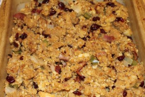Heat oven to 350. Spray 8″ square pan with Pam. In skillet, cook bacon until browned but not crisp. Stir in pepper and onion. Cook 3 – 4 minutes. Stir in cranberries. Add water and heat to boiling. Remove from heat and stir in stuffing mix and spices. Spoon into baking dish and cover with foil. Bake 30 minutes or until heated through.