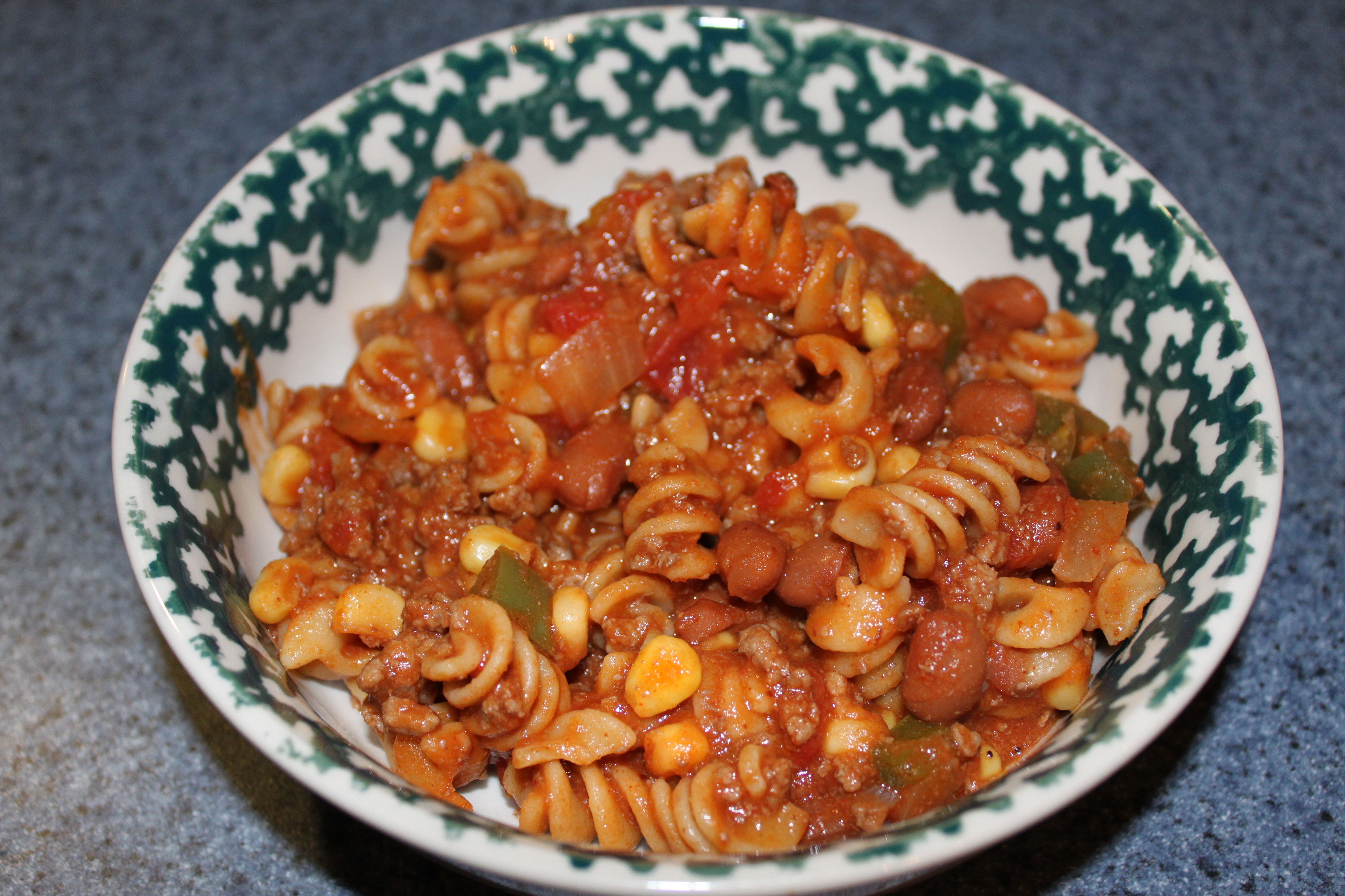 Cook pasta according to package directions. Meanwhile, in a large nonstick skillet (when they say large, they mean large, I had to transfer to a bigger one half way through so start with a big one), cook the beef, onion, green pepper and garlic over medium heat until meat is no longer pink then drain. Stir in remaining ingredients. Bring to a boil. Reduce heat and simmer, uncovered, for 10 minutes, stirring occasionally. Drain pasta and stir into stew.