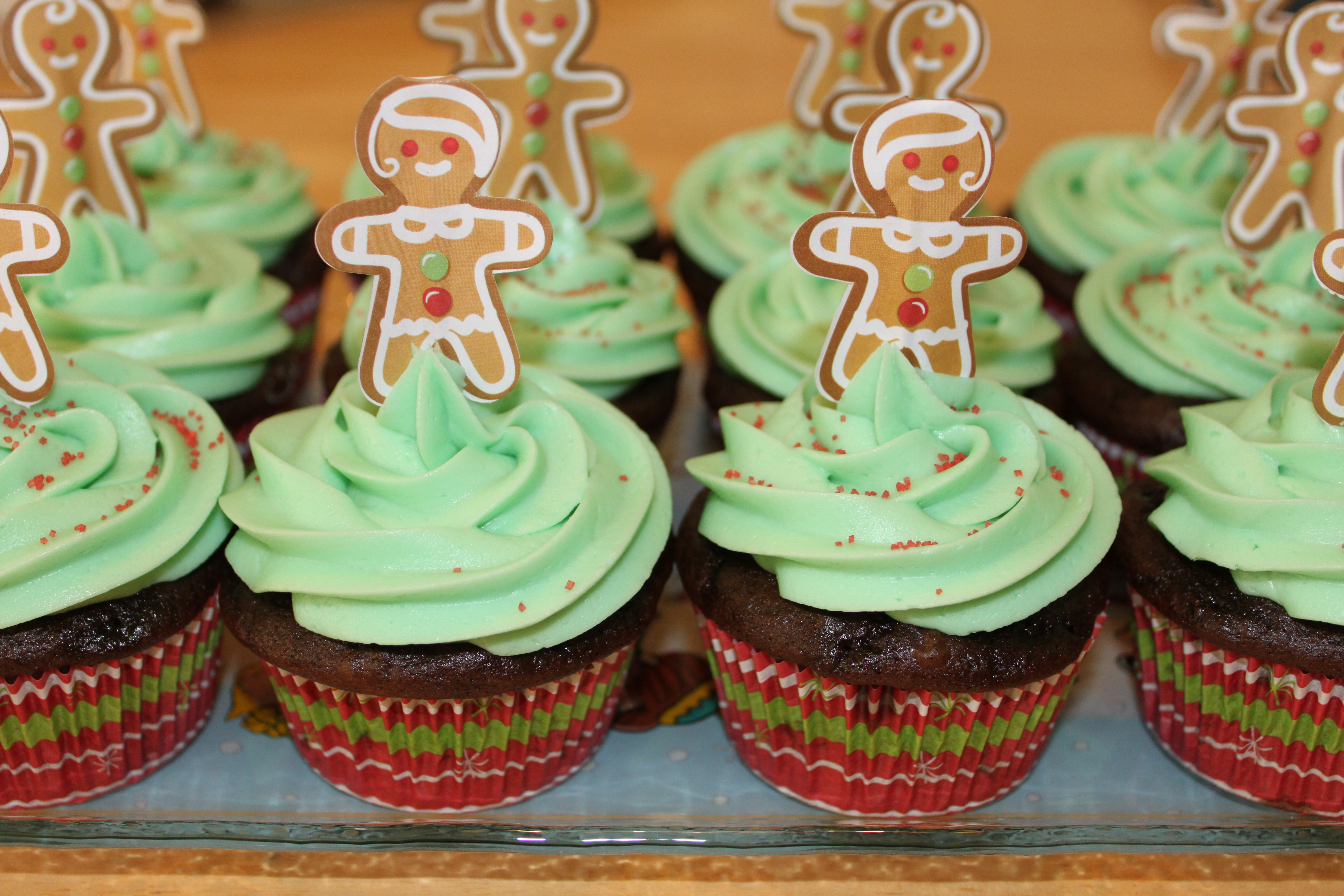 The cupcake recipe comes from Wendy Paul’s “101 Gourmet Cupcakes in 10 Minutes”. I’m not sure where I got this frosting recipe from but it is my favorite, easy to make and tasty. It is already on the blog somewhere but I’ll put it on again here so you don’t have to go looking for it if you want to make these cupcakes. The cupcake paper liners and the little paper gingerbread men on toothpicks came together in a set and I think I got them at Target but it was last year after Christmas when everything was 50% off! They make decorating so easy and cute.