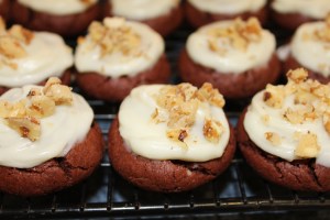 This is a Betty Crocker recipe. I didn’t have enough red food coloring so they didn’t come out very red. I also made homemade cream cheese frosting rather than use the canned kind. They are very tasty!