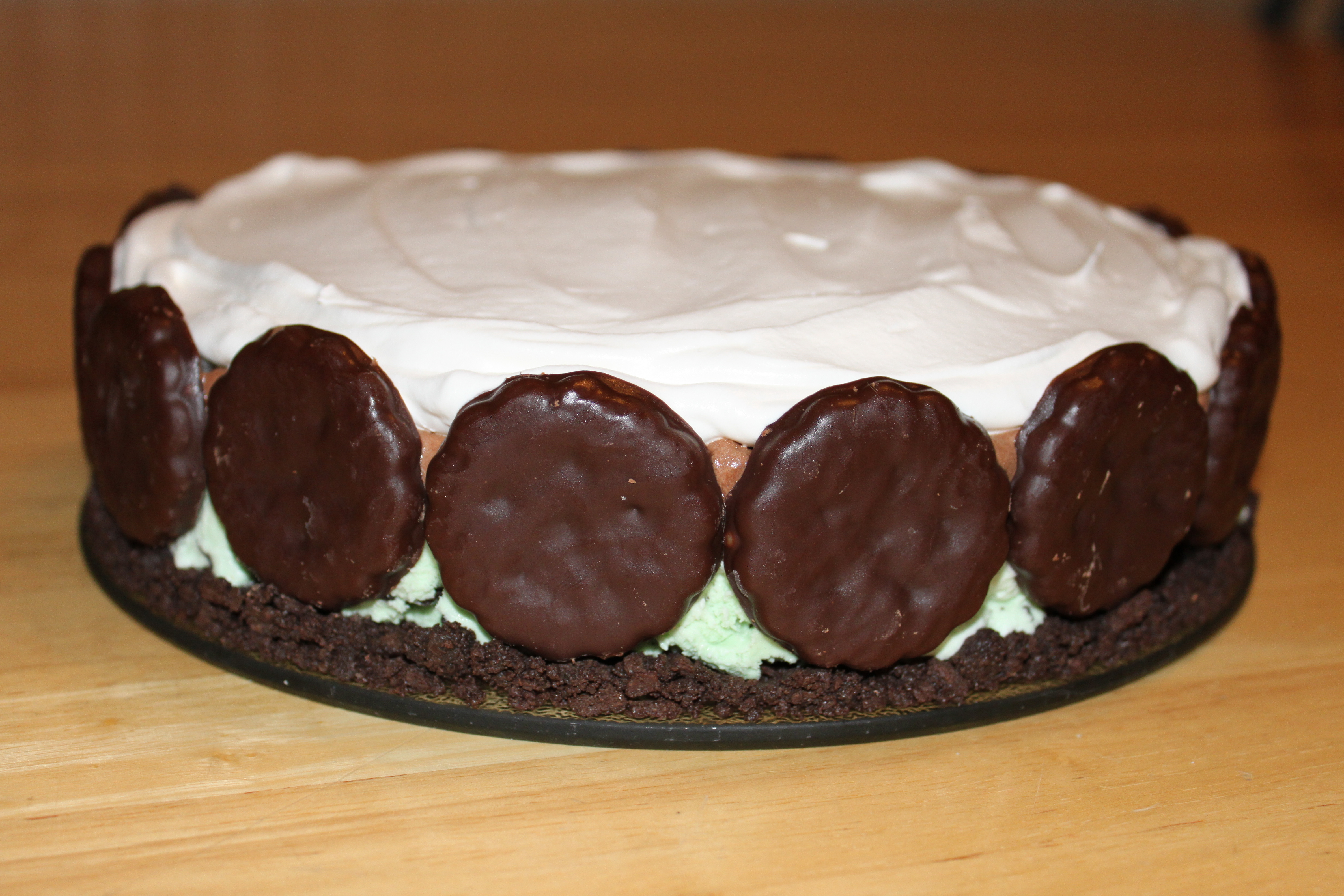 2 Line inside collar of pan with remaining cookies (with rounded or front sides of cookies facing the collar). For filling, place mint chocolate chip ice cream in refrigerator 20 minutes to soften. (A note from me – 20 minutes wasn’t long enough so I tried 30 and even then it was still hard to spread so maybe 40 minutes? Guess you’ll have to experiment.) Scoop mint chocolate chip ice cream onto crust. Carefully spread ice cream evenly over crust. Cover and freeze 1 hour. Place chocolate ice cream in refrigerator 20 minutes (or longer?) before removing cake from freezer; scoop chocolate ice cream over mint ice cream. Carefully spread evenly and return to freezer.
