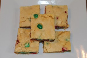 Preheat oven to 350. Mix cake mix, eggs and oil. Stir in M & M’s. Mixture will be stiff. Press dough into greased 9 x 13″ pan. Bake 15 – 20 minutes.