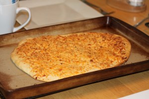 I made a big dinner for Valentine’s Day – Hearty Stuffed Shells (Bob’s favorite, will be the next post), Green Beans with Garlic Butter and Walnuts (everyone loves these, they are already on the blog) and this Triple Cheese Flatbread which I got in an email from Bisquick. It is pretty easy to make and really tasty, we ate almost the whole thing.