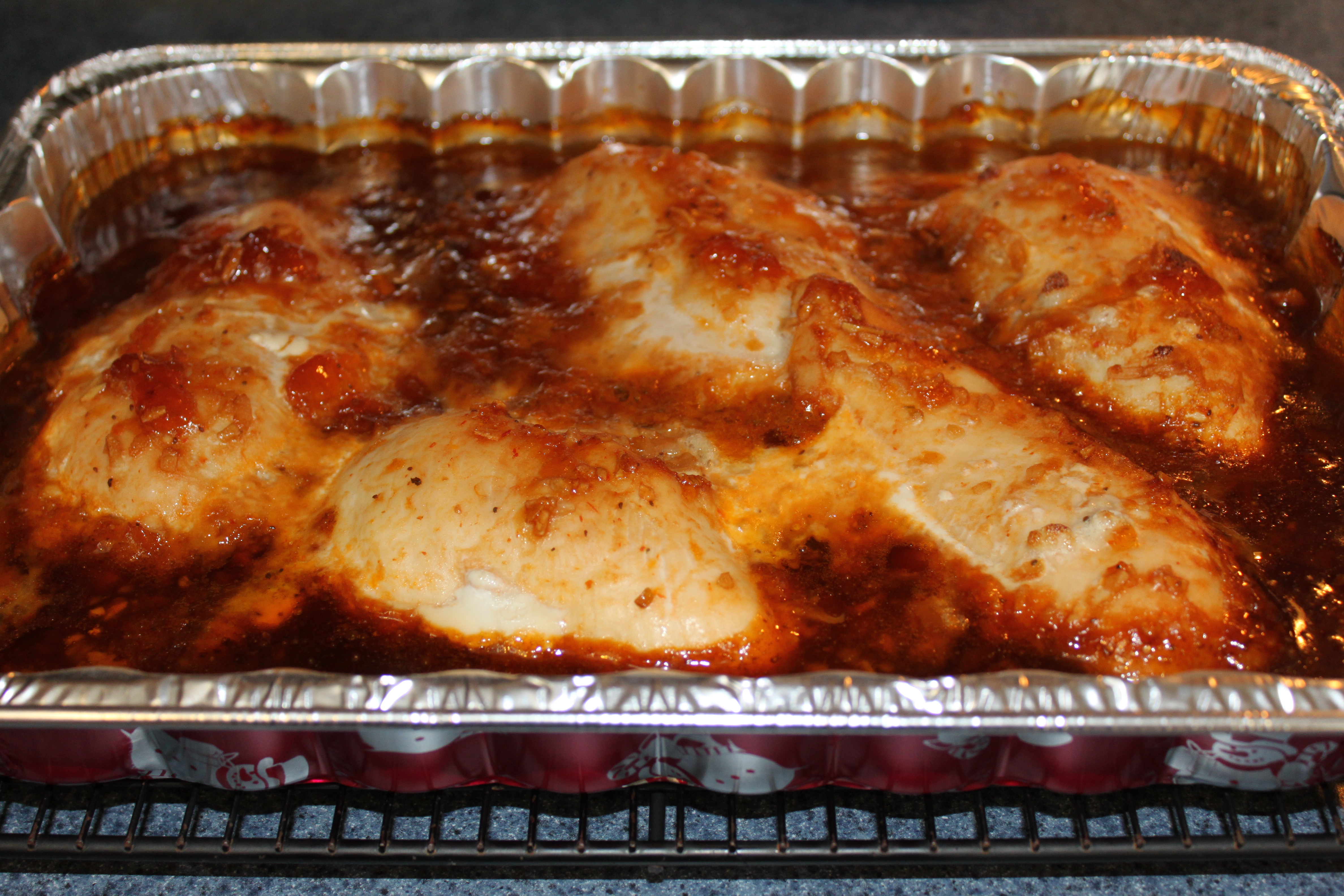 Put raw chicken pieces in 12 x 9″ casserole dish. Mix remaining ingredients and pour over chicken. Bake in a 300 oven uncovered for 2 hours.