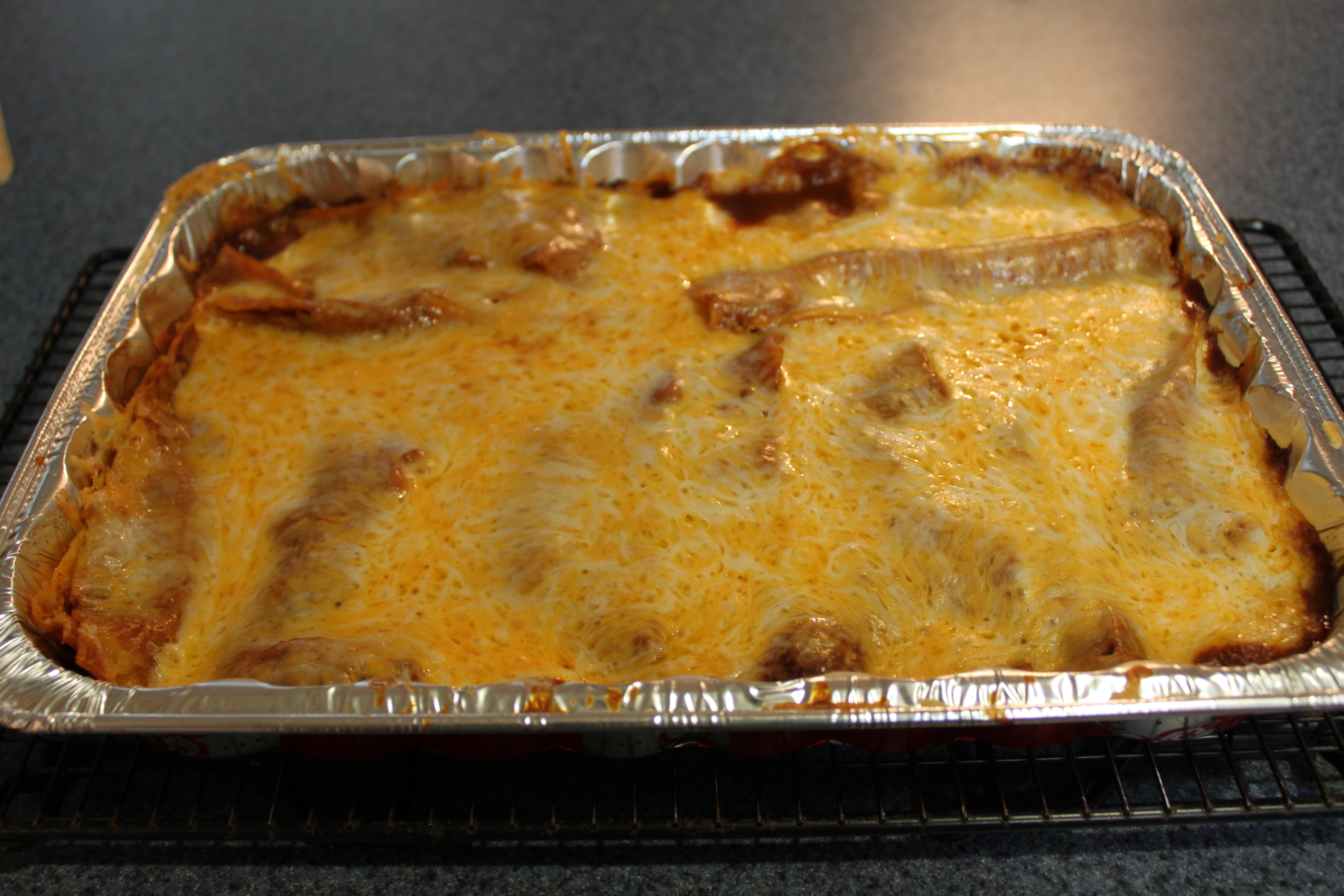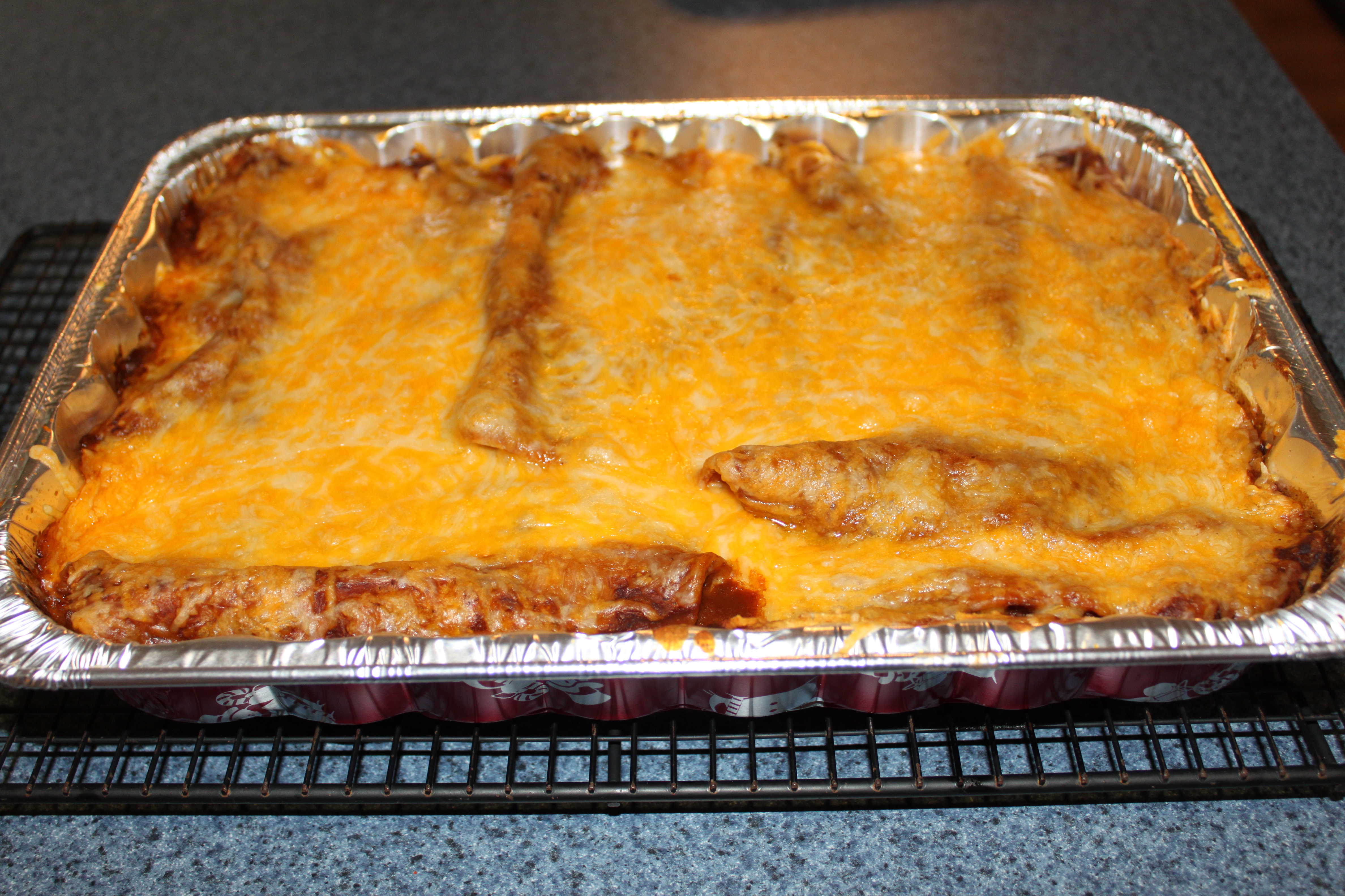 More food for Patty and Raymond! The recipe as listed below made the above two pans of enchiladas. The instructions said you could make them soft or crispy, so I did a pan of each (soft on left, crispy on right).