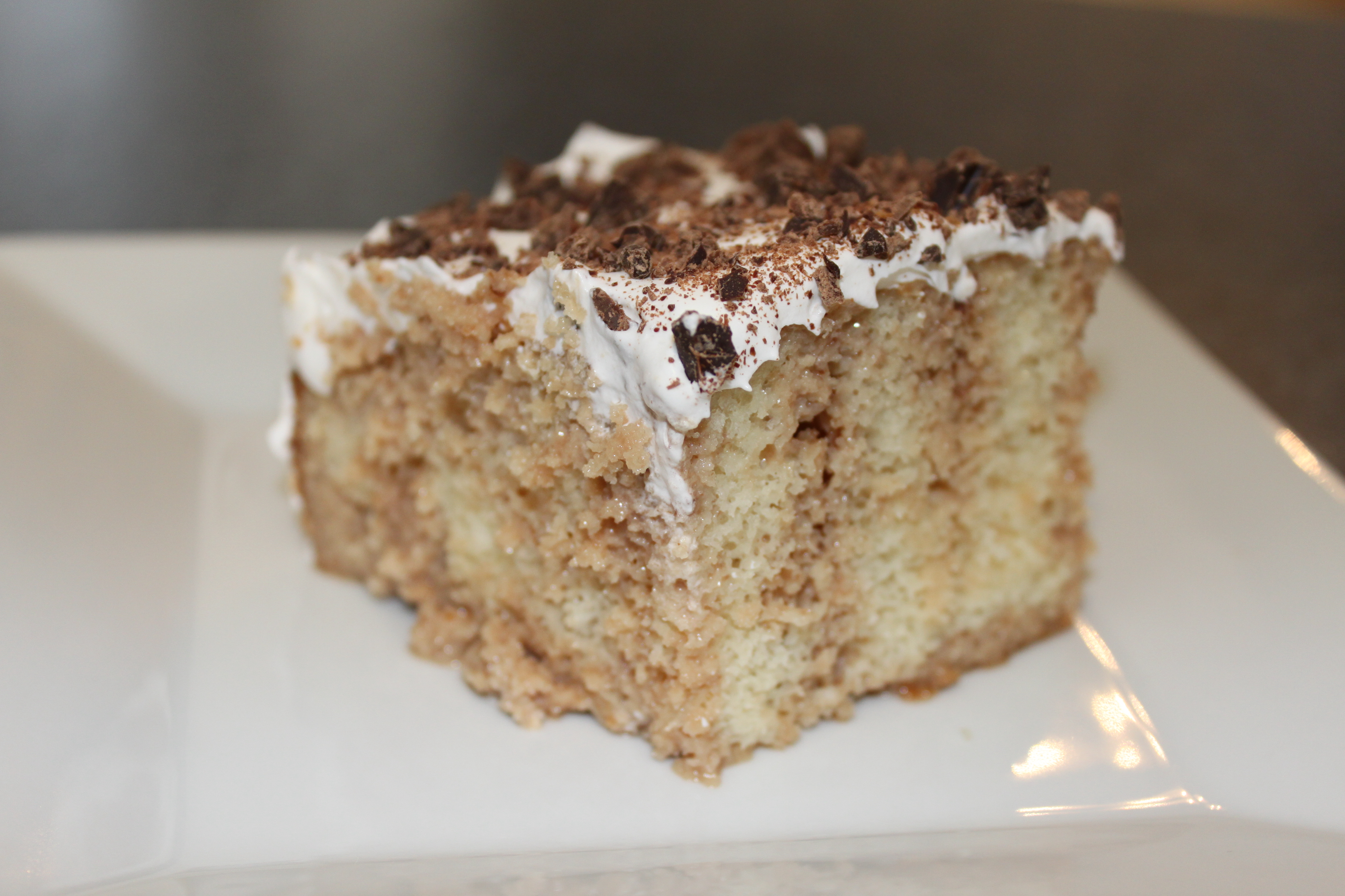 2 Melt 3 of the chocolate squares as directed on package and set aside. Place milks and sour cream in blender and blend until smooth. (I whisked it all together in a large bowl.) Add melted chocolate and mix well. Gradually pour over cake, re-piercing holes in cake as needed until milk mixture is absorbed. (There is a lot of liquid. Don’t worry about it all absorbing while you are pouring; the cake will soak it all up while it’s in the fridge.) Refrigerate 1 hour. Meanwhile, make curls or shavings from remaining chocolate square.