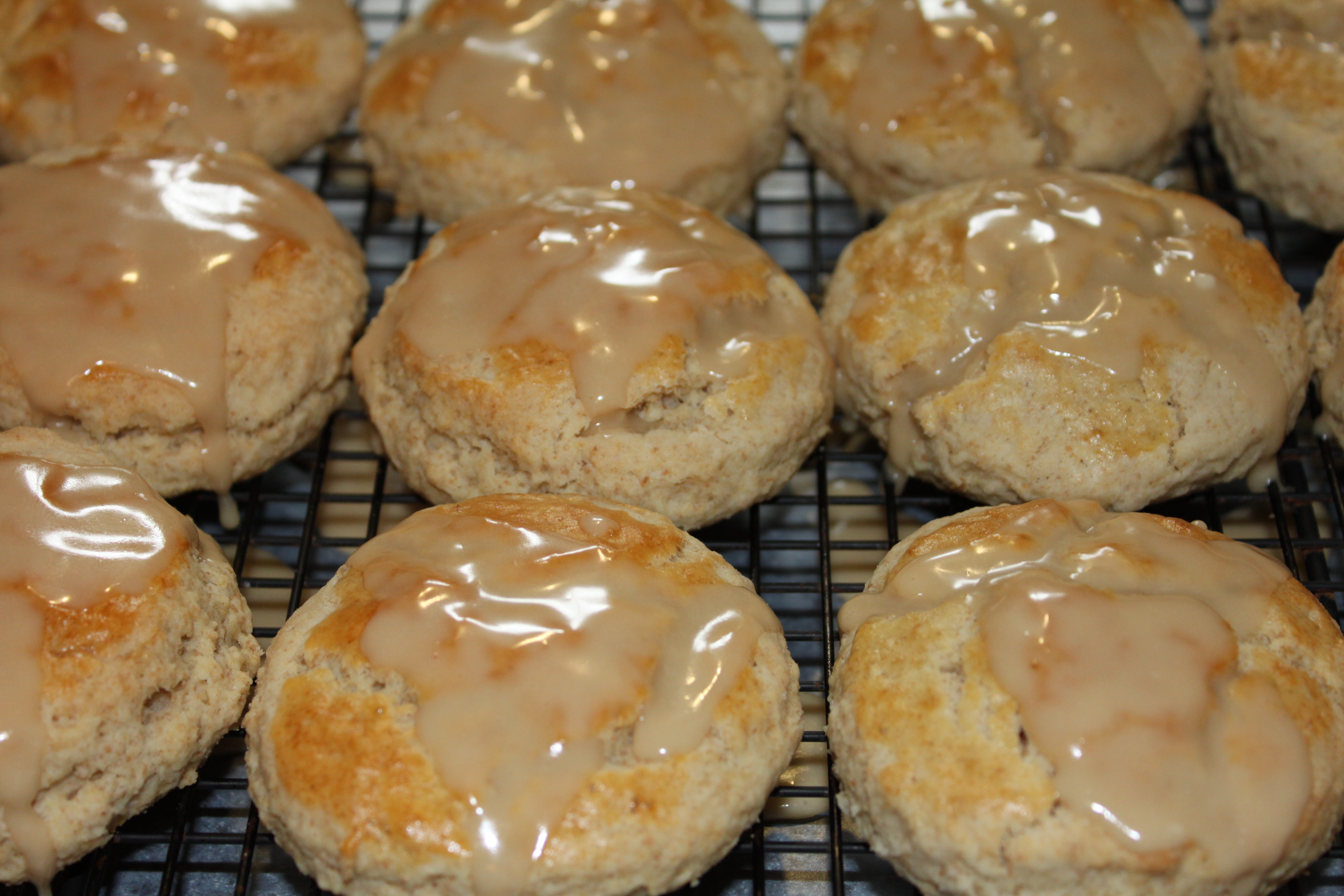 4 To make the glaze, combine the powdered sugar, maple syrup and vanilla. When the scones are done, cool for 5 minutes and drizzle each scone with glaze. Ina then sprinkles some uncooked oats on top for garnish but I decided to leave those off. The warmer the scones are when you glaze them, the thinner the glaze will be. (I let mine cool longer than 5 minutes so that the glaze would be thicker.)