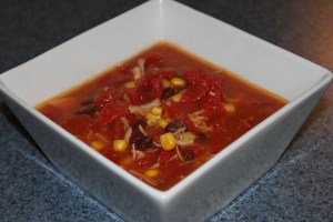 1 In a large saucepan, heat oil over medium. Cook garlic and chili powder until fragrant, about 1 minute. Add tomatoes with juice, beans, broth, corn and 1 cup water (and chicken, if using and I didn’t add the 1 cup of water because I had already added the juice from both the can of corn and the can of chicken); season with salt and pepper.