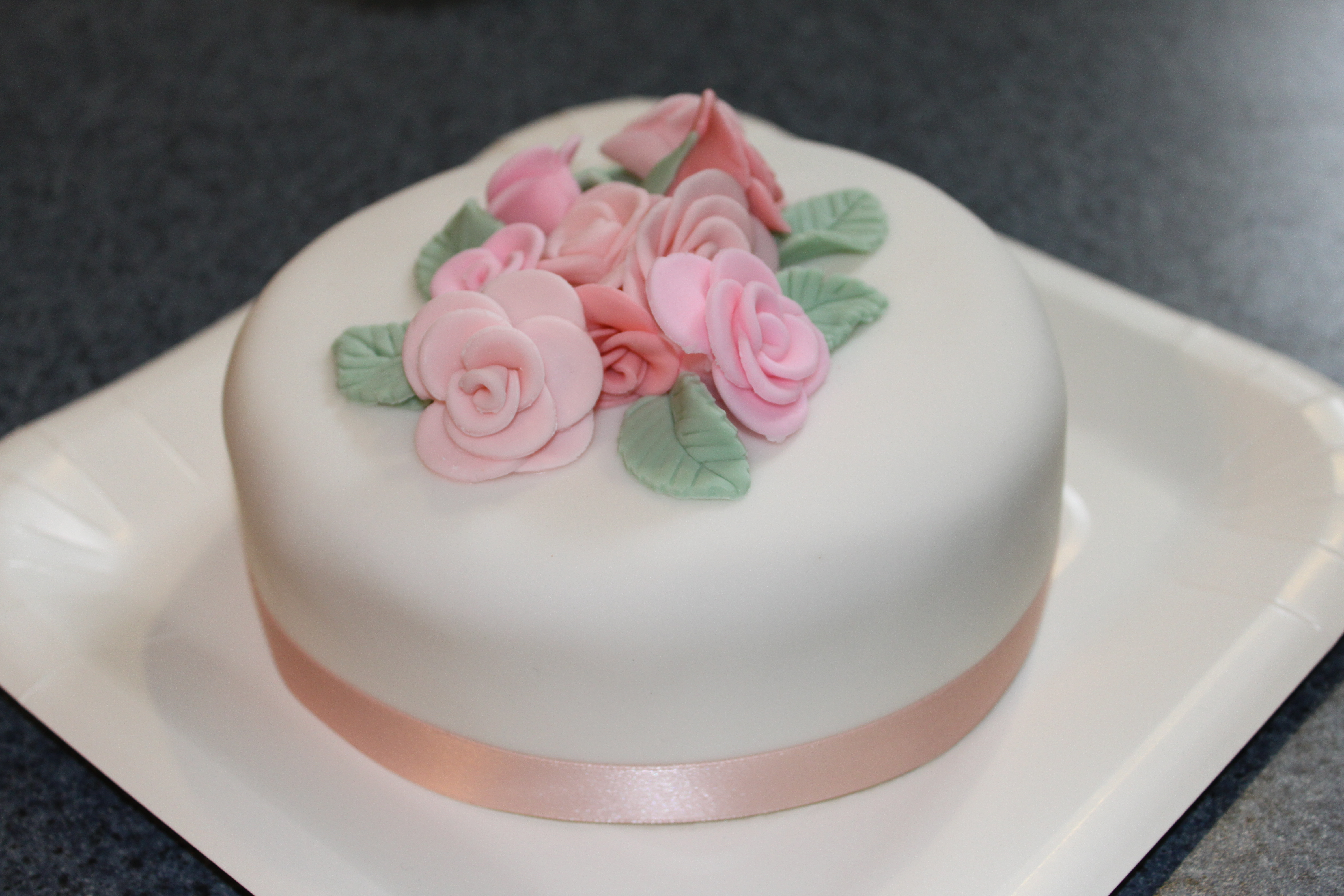 This was a little thank you for all the wardrobe ladies I’ve been working with the past week and a half (plus an opportunity for Courtney to practice her flower making skills). The cake is about 6″ round and is that White (or in this case Chocolate) Sour Cream Almond Cake recipe plus my favorite Vanilla Buttercream Frosting and then topped with Wilton White Fondant. Came our pretty cute and Cort’s flowers are awesome! We’re getting better with each fondant cake we make! 🙂