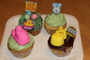 For decorating, I used all the leftover frosting I had from the graduation cupcakes and the fondant cake so some of it was canned and some was homemade. For the nest cupcakes, I dumped a bunch of coconut in a bowl and put about 10 drops of green food coloring in there and mixed it with a spoon until the coconut was green then I frosted the cupcakes and gently rolled them around the bowl until they were covered in coconut. I found the liners and picks at the dollar store.