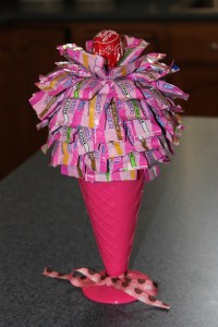 I got this cute little book the other day from http://www.paperbackswap.com called “Candy Bouquets Create Your Own Gifts and Centerpieces” and this is the first creation that Courtney and I made from that book (more are soon to follow I’m sure). The book is full of cute little ideas for candy centered gifts for all occasions. We made these for 2 special friends of mine that I visit every month but didn’t make it to visit this month so treats instead! I’ll give you the instructions for the one in the book which is called “Milky Way Parfait” and I’ll also give you the changes that we made to make ours (really the only changes were that they used a glass ice cream dish and we used the pink plastic one and they used mini Milky Way bars and we used Baskin Robbins hard candies). We bought everything we needed to make these at the Dollar Store (except for the pins and the Tootsie Pops). They came out really cute!