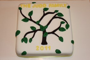 I met Kristy at the Women In Business luncheon where I made the same offer to those ladies that Courtney and I made on Facebook which is that we would love to make a cake for any of them for just the cost of ingredients so that we can keep on practicing. Kristy talked to me after the luncheon and asked if we could make a cake for her family reunion that she had coming up and of course I said we would love to. She needed a cake for the reunion but there were a couple of other events that would be happening at that same time as well. One of the attendees of the reunion, a little girl, would be celebrating a birthday during the reunion and the reunion was being held at the same time as a set of grandparent’s anniversary would fall, both grandparents have passed away but the family wanted to pay tribute to them at the reunion. Kristy wanted all those elements represented on the cake. After talking for awhile we decided that all 3 of those events probably wouldn’t go together well on 1 cake so we decided to do 2. This is the first to represent the reunion itself. Kristy wanted to have a tree to represent a family tree so Courtney made this awesome tree! This is a 10″ square White Almond Sour Cream cake covered with Vanilla Buttercream Frosting and then covered in White Buttercream Fondant from Funfinity. Cort made the tree trunk freehand and then used a mold for the branches and leaves (mold from Michaels) and I used little cutters for the letters and numbers and then finished with a yellow ribbon around the bottom. It came out much cuter than I expected (I seem to always be underestimating our abilities which isn’t bad because then I’m always pleasantly surprised!). Happy Reunion to the Judd family!