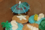 Here are the finished cupcakes decorated in the camp’s beach theme.  I frosted them with my homemade Vanilla Buttercream Frosting.  For the sand, I crushed graham crackers in my food processor and then poured them on a plate and dipped the freshly frosted cupcakes in them, rolling around gently as needed to cover the tops.  For the ocean, I used Wilton Blue Sparkling Sugar, poured it in a bowl and dipped the tops of the cupcakes in to cover.  For half ocean, half beach, just carefully dip one half of the cupcake in one and the other half of the cupcake in the other.  After the dipping, I topped them with either a paper drink umbrella, a plastic flower pick, a plastic palm tree pick or an accordion palm tree pick all of which I bought at either Zurchers or Partyland.  Yesterday I made all the shells and sea creatures using a candy mold and Wilton candy melts.  One bag of white melts made about 80 candies which was perfect because that’s about how many cupcakes I made.  So there are my beach themed cupcakes and now I need a nap!  🙂