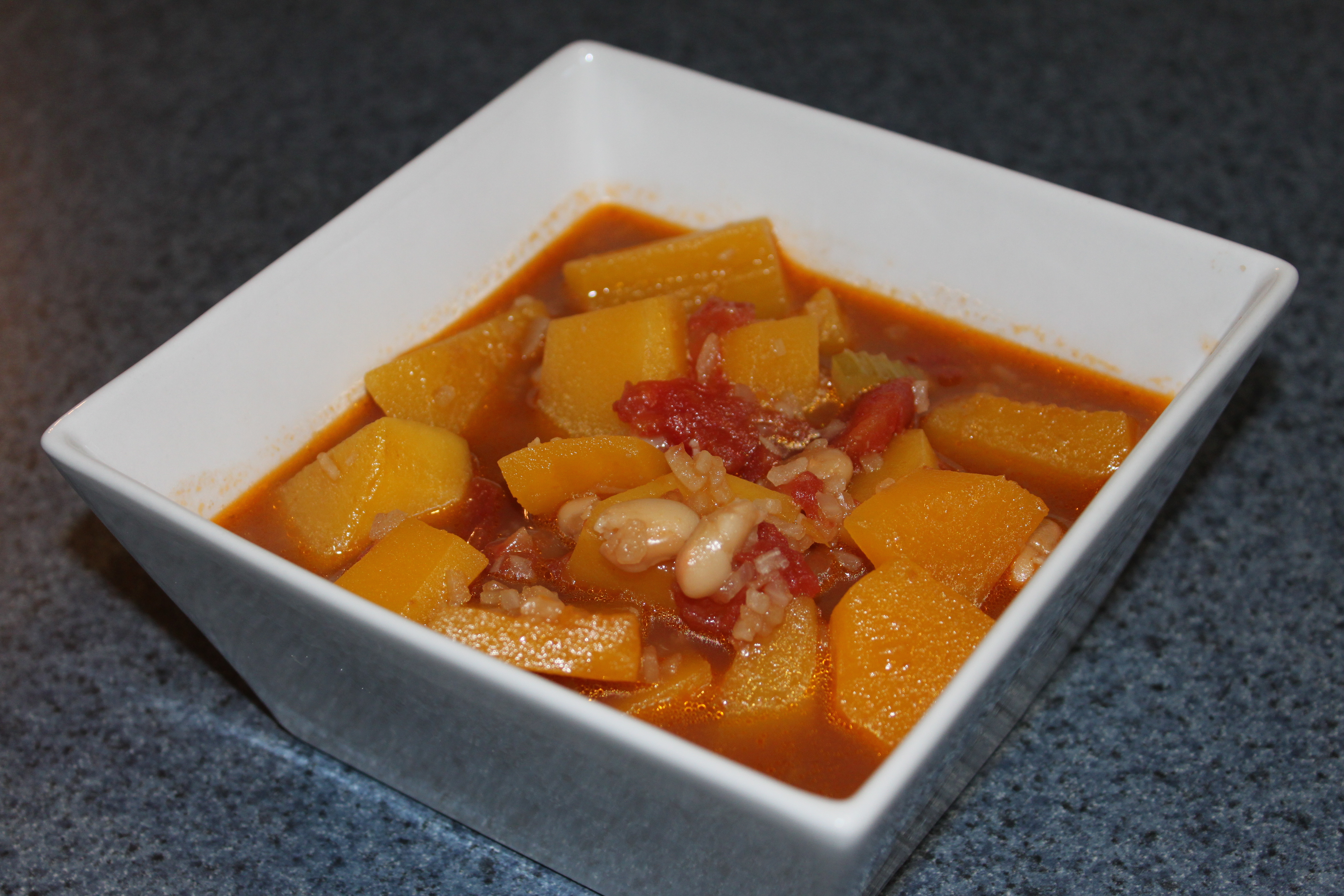 The 3 butternut squash that we got in last week’s Bountiful Basket have been sitting on the counter staring at me for a week now so I went online today and googled “butternut squash recipes” and found this one at http://www.marthastewart.com and it sounded like one that my family would like so I gave it a try. It smelled great cooking and Zach just had a bowl and said it was good and that he liked the squash so I guess it’s a keeper.