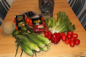 Pretty good haul! I’m making Mango Confetti Salsa again and I’m also going to make a Tres Leche Cake and top with it with the strawberries (both those recipes are already on the blog). We’re having a barbecue tomorrow with Bob’s sister Mary and her daughter Clara so we’ll do the corn on the cob and maybe a green salad or a fruit bowl. Gotta love the Bountiful Basket! Need more info? Check out http://www.bountifulbasket.org