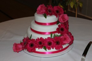 Here is Josh and Richelle’s wedding cake. The 1st and 3rd layers are Almond Poppy Seed and the 2nd and 4th layers are Brown Sugar, all covered with Vanilla Buttercream Frosting and then Pettinice Buttercream Fondant. Richelle’s colors were hot pink and blue but we decided to go with just the hot pink on the cake so we wrapped the layers with hot pink ribbon and then Richelle’s florist got us the hot pink daisies and roses and a little bit of greenery so we did a cascade of flowers down the side of the cake. Josh said it was “gorgeous” so hopefully Richelle will be just as happy with it. Congratulations Josh and Richelle!