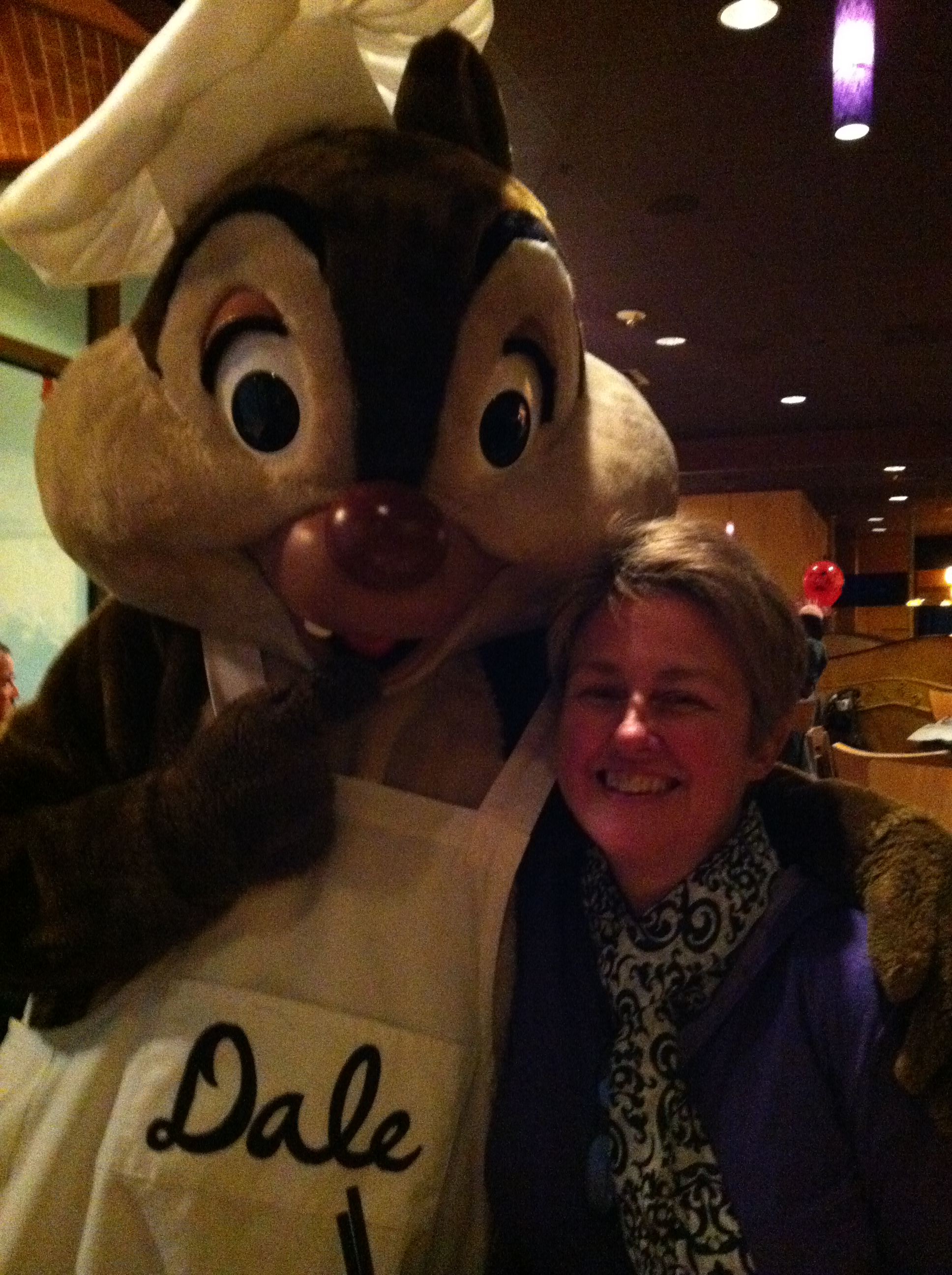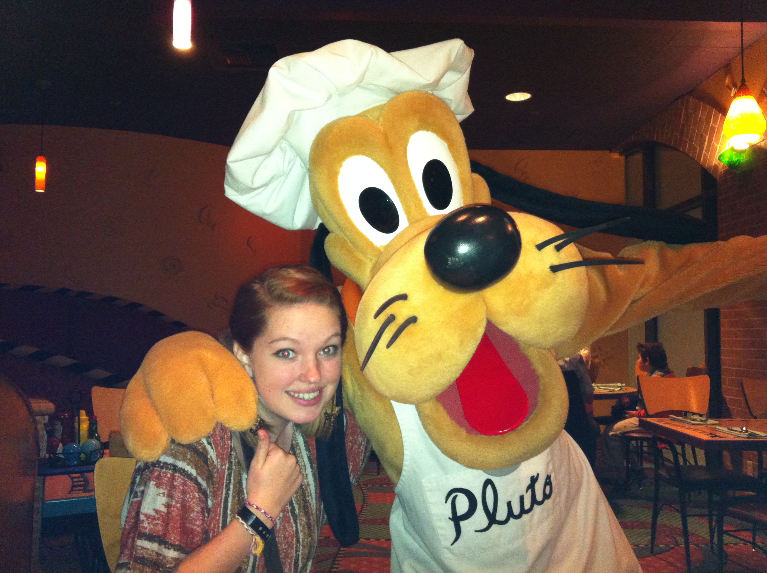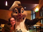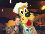 Last post on our Disneyland food experiences and then it’s on to Halloween! My husband Bob got our Disneyland package through Costco Travel and in addition to our hotel and park hopper tickets, it came with some other extra things such as 2 free Disney lanyards and Buzz Lightyear pins, 2 free Buzz Lightyear luggage tags, a $25 gift card, early admission to Toontown, early admission to Disneyland, preferred seating for 4 of the shows and a free dinner at Goofy’s Kitchen. I highly recommend Costco Travel, the price for the hotel and passes were great and then they threw in all this other stuff. The dinner at Goofy’s Kitchen was almost $90 but for us it was completely free! Goofy’s Kitchen is located inside the Disneyland Hotel and if you have little kids, it would be an awesome place to have dinner. It’s a buffet with choices for both kids and adults, peanut butter and jelly pizza to prime rib, yum! When you arrive, chef Goofy greets you and you have your picture taken with him (which I didn’t buy so can’t post) then they seat you and you can help yourself to the buffet then as you eat the characters come to you. Here is Courtney (and 1 of me) with the characters.