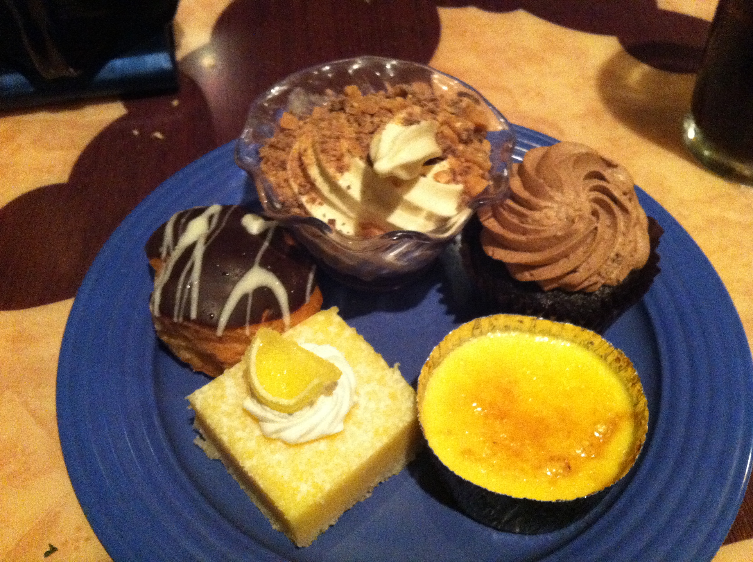 And here is a picture of my dessert plate with a piece of lemon cake, a chocolate cupcake, a cream puff, creme brulee and a dish of ice cream with heath bar on top and no, I did not eat it all but I did try it all! (I didn’t get a picture of my dinner plate with the fantastic prime rib because I was so hungry that I forgot to take a pic!). So check out Goofy’s Kitchen, especially if you have small kids, it would be worth the $!