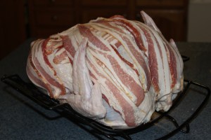 Bob wanted to try Bacon Wrapped Turkey this year so he was in charge of the bird and did a great job. We bought an 18 pound Butterball turkey; first he brushed it with melted butter, salted it and then covered it with about 2 packages of bacon.