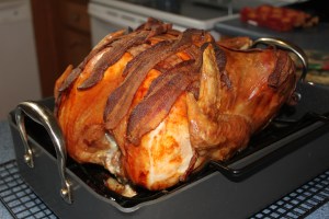 It was delicious but to be honest I couldn’t really tell that it had been wrapped in bacon. It tasted great but not like bacon so I don’t know if it was worth the extra effort. Gobble, gobble!