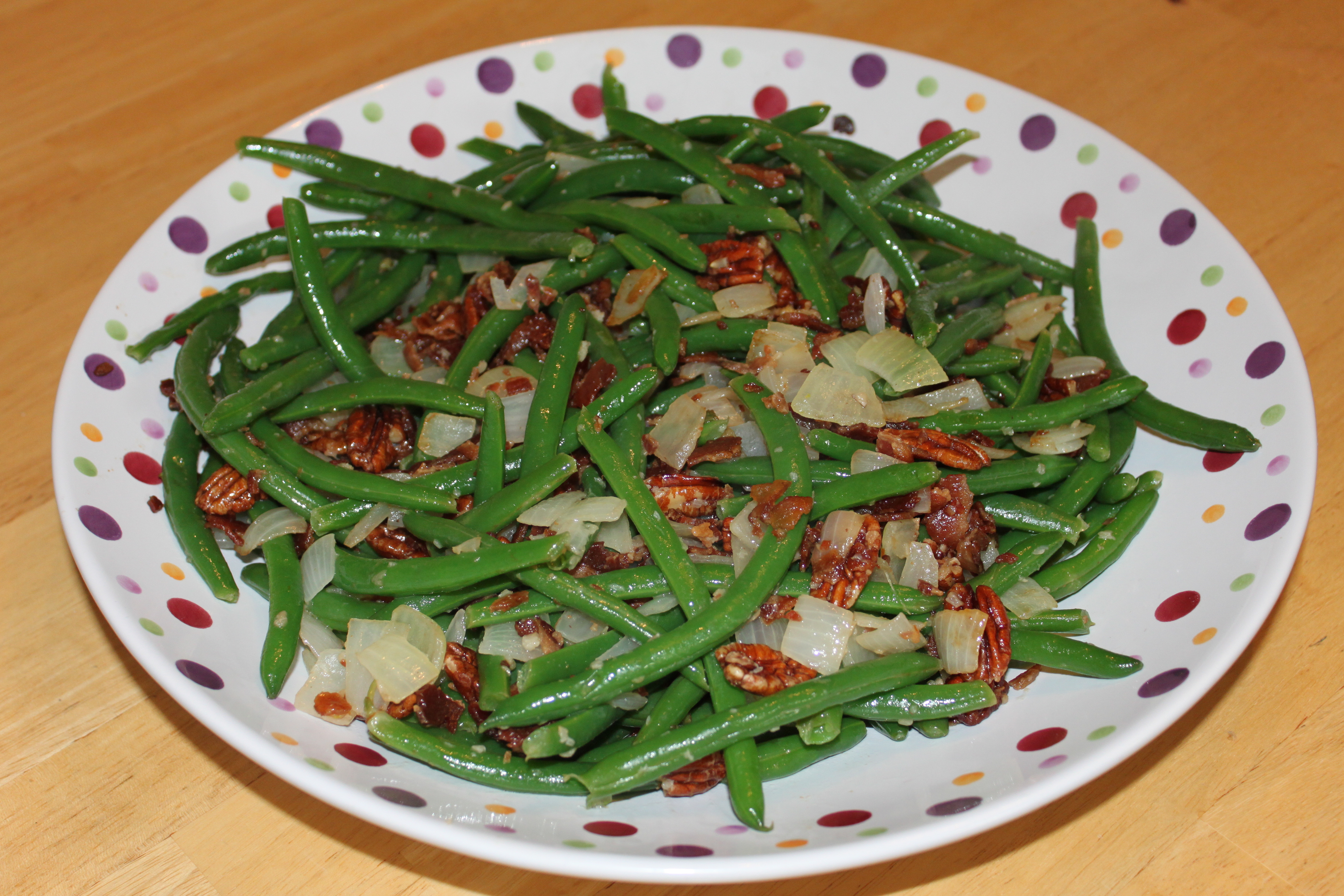 2  Cook bacon in large, heavy duty saute pan until crisp, about 5 minutes.  Remove bacon to paper lined plate to drain.  Spoon off excess bacon grease, leaving 2 tablespoons in pan.  Add onion to pan and saute until soft and very tender, 4 – 5 minutes.  Sprinkle in garlic and red pepper flakes and saute until just fragrant, about 1 minute.  Add green beans and pecans and cook until heated through, 5 – 6 minutes.  Return bacon to pan, pour in lemon juice and toss.  Season with salt and pepper.