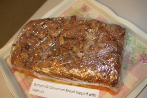 Combine flour, baking soda and salt in a large bowl. Combine oil and 1 1/2 cups sugar in a small bowl. Add buttermilk and eggs to oil and sugar and mix well. Stir into dry ingredients just until moistened. Fill 2 greased 8 x 4 x 2″ loaf pans about 1/3 full with batter. Combine cinnamon and remaining sugar and sprinkle half over batter. Top with remaining batter and cinnamon sugar. Swirl batter with a knife. (A tip from me, the batter is really thick so don’t swirl all the way out to the edge of the pan as it will make the bread a little unstable after it has baked.) Sprinkle with nuts. Bake at 350 for 45 – 55 minutes or until a toothpick inserted near the center comes out clean. Cool in pans for 10 minutes before removing.