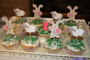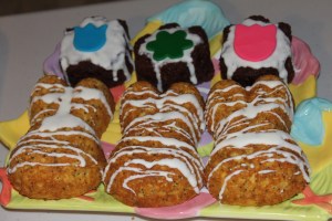 I also made these cupcakes for some Bunco prizes. I made regular shaped cupcakes (pictured here) and then I made some in the shape of bunnies (pictured at the end of the post). This recipe comes from Wendy Paul’s “101 Gourmet Cupcakes in 10 Minutes”. I baked these cupcakes in Easter liners and topped them with my favorite buttercream icing and then sprinkles that looked like grass and eggs and then stuck either a lamb or bunny pick in each one (liners, sprinkles and picks all from Hobby Lobby). The little pink bunny in the middle cupcake is cut out of fondant with tiny Easter shaped cookie cutters that I also found at Hobby Lobby. For the bunny shaped cupcakes, I just drizzled them with frosting so that you could clearly see that they were bunny shaped.