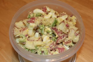 We got a little over 3 pounds of red potatoes in our Bountiful Basket yesterday and Bob loves potato salad so I went online and surfed around a bit for a red potato salad recipe and found this one on http://www.allrecipes.com. I used it as a starting point and modified it a bit to lower the calorie count so I’ll give you the original recipe and also the changes that I made. The original recipe said that it yielded 12 servings and that each serving was 315 calories; my modified version yields 10 one cup servings at 145 calories each, and it still tastes great!