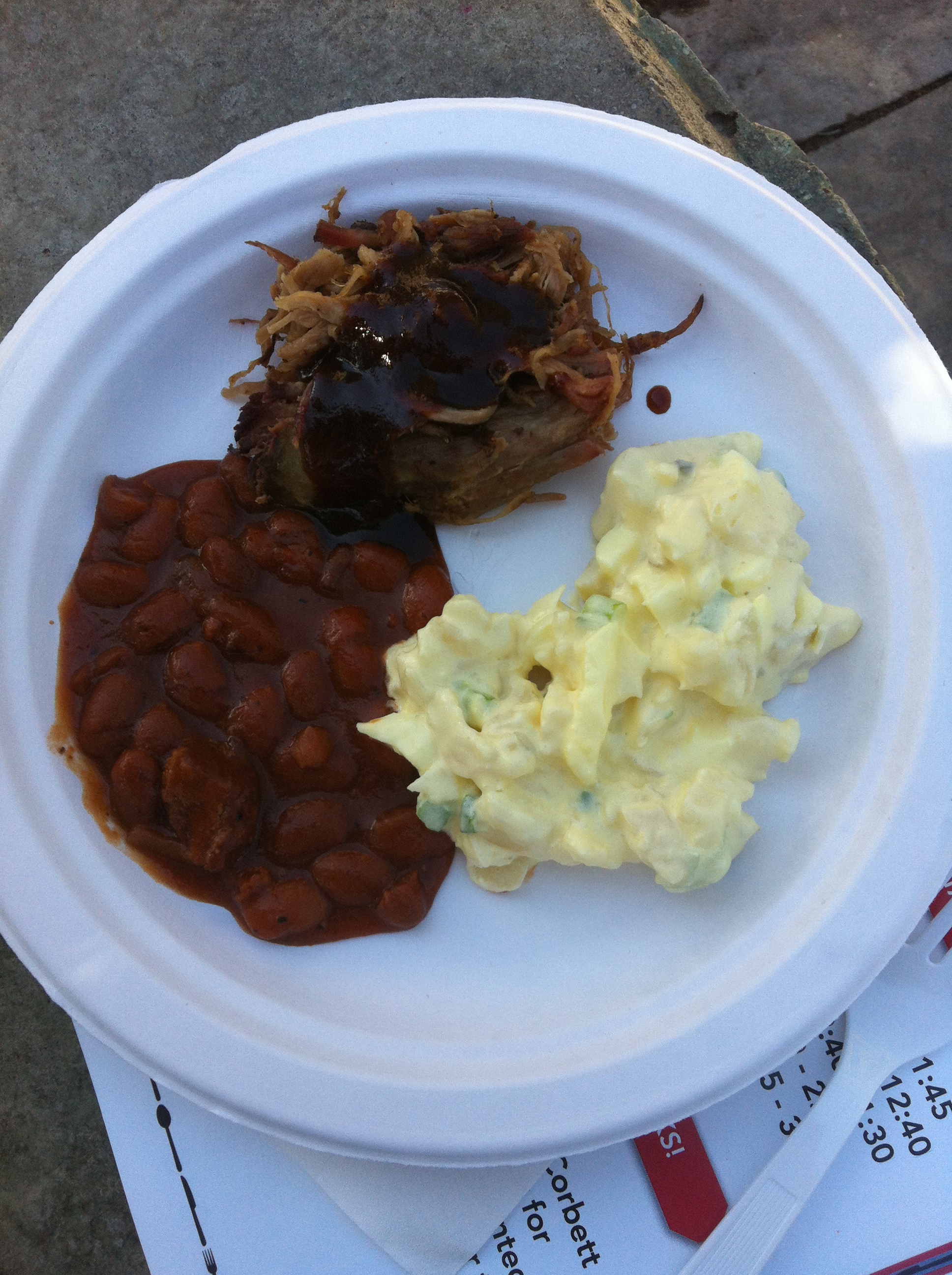 On the left is pepperoni pizza from Malawi’s Pizza (yum-o!) and some shredded pork and rice from Rumbi and then a full plate from Goodwood Barbeque with potato salad, barbeque beans and then some shredded meat, all good but by this time I was already getting pretty full so only took a bite of each.