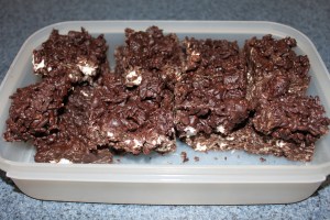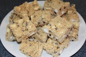 3 Stir in Rice Krispies and let sit for 10 minutes or until cool. (You don’t want the marshmallows and chocolate chips to melt when you add them.)
