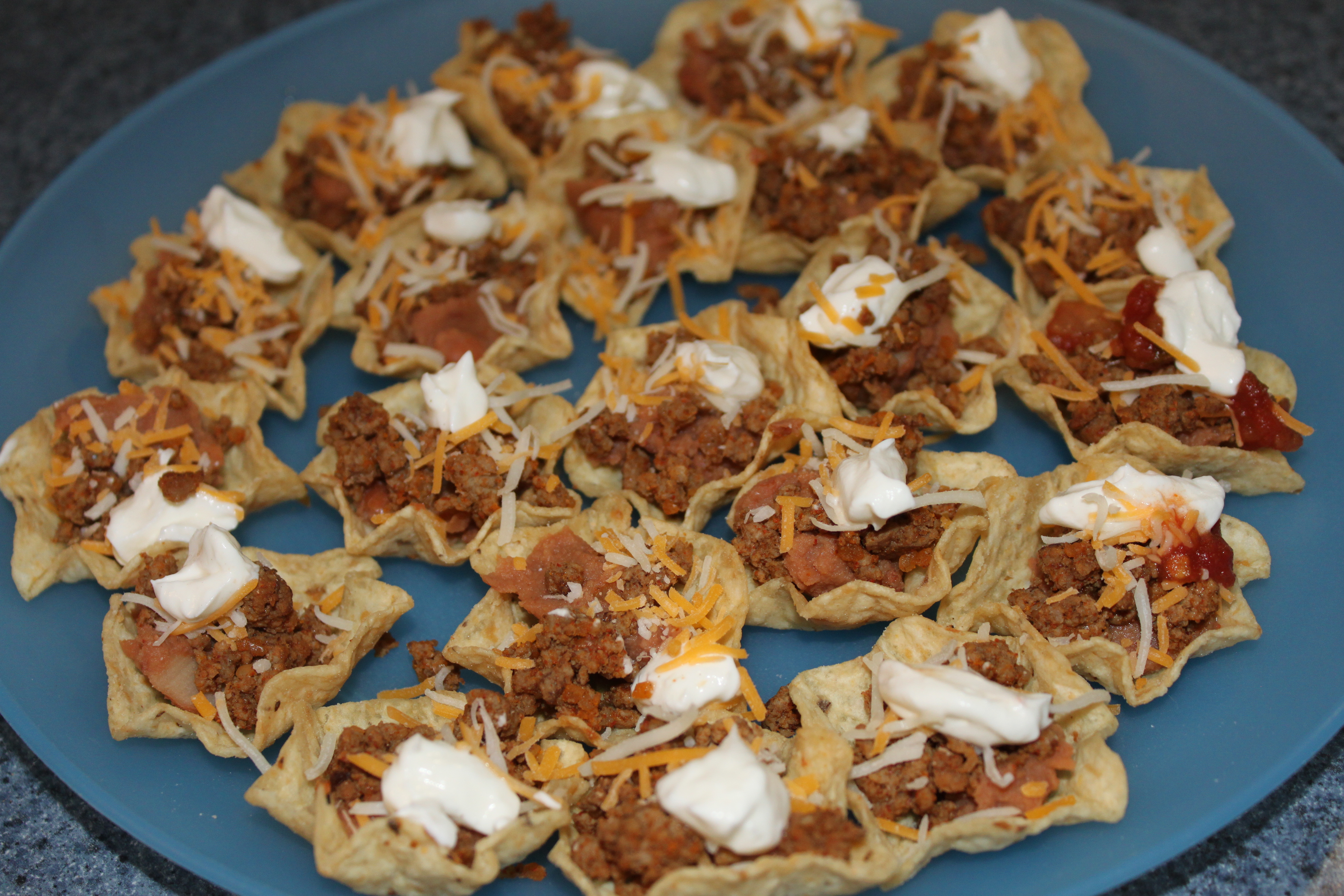 Set chips on a large platter and layer with beans, meat, cheese, salsa, sour cream and olives.