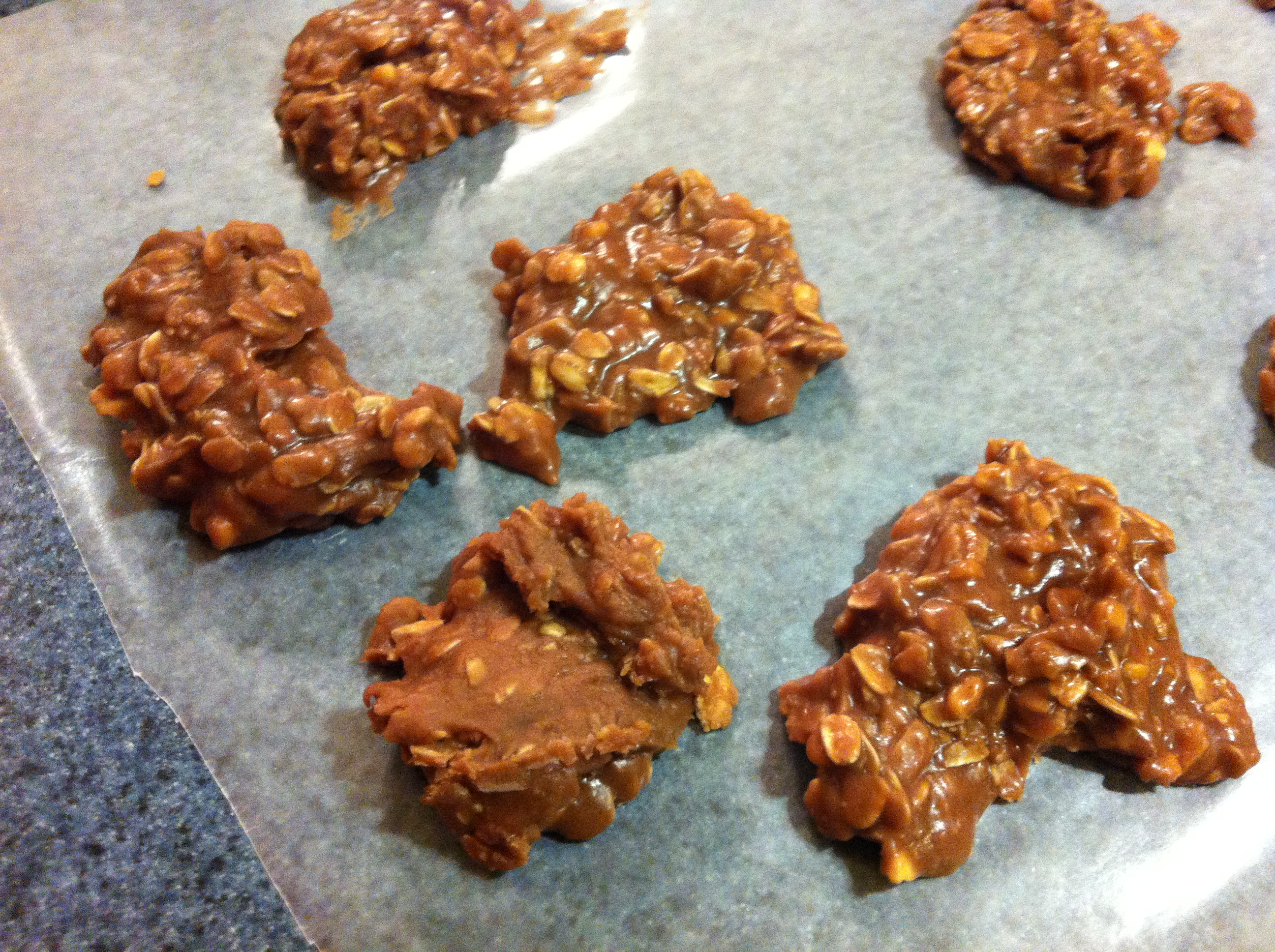 Quickly add 2 cups of quick uncooked oatmeal and mix.  Drop by spoonfuls onto wax paper or foil.  Let cool before eating (which turned out to be the hardest part of the recipe).