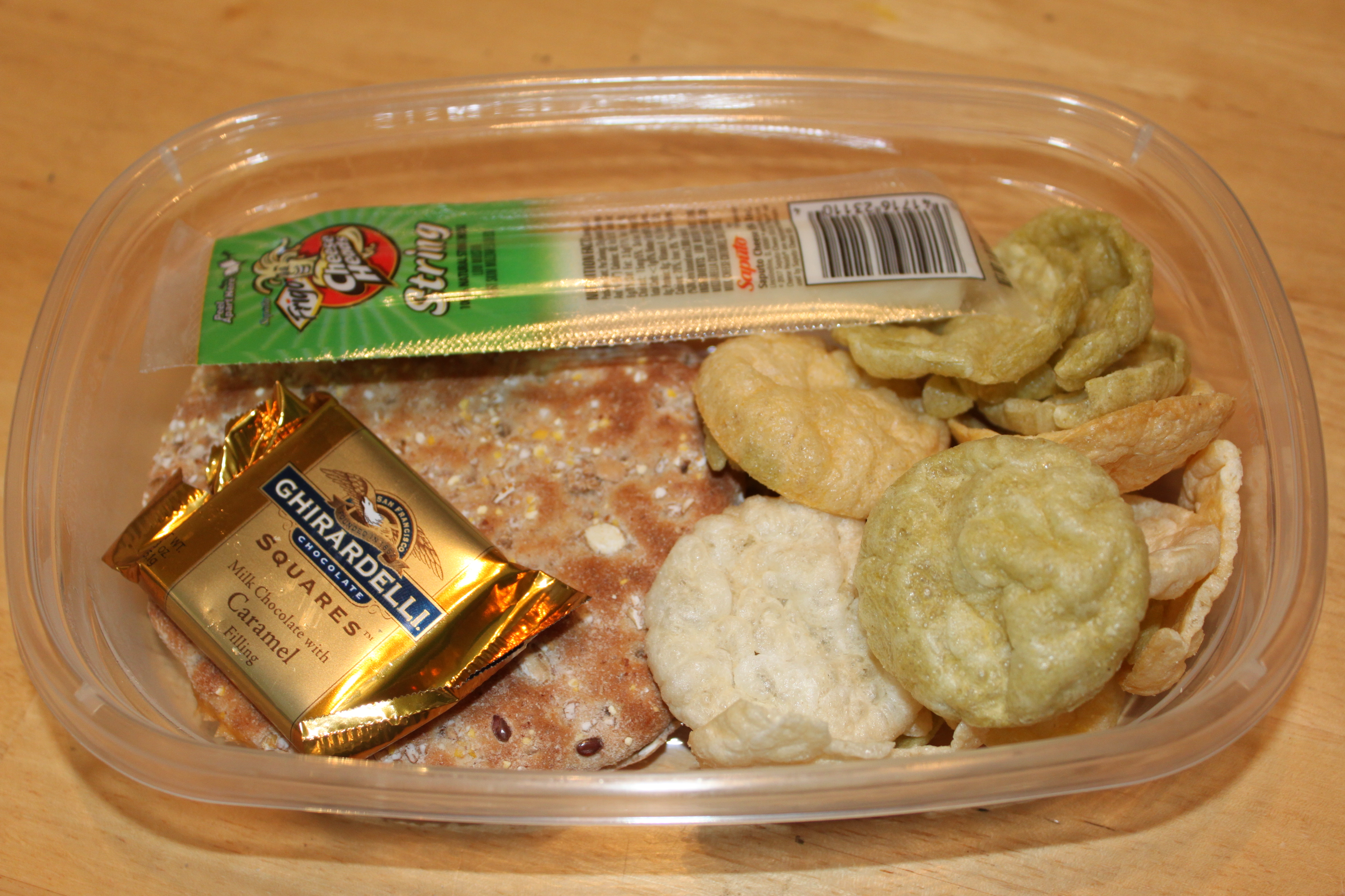 Crunchy peanut butter and strawberry jelly on a whole grain sandwich thin, cheese stick, veggie chips and a Ghiradelli chocolate
