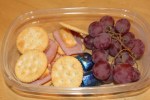 Ham and cheese on Ritz crackers, red grapes and 2 Hershey Bliss chocolates