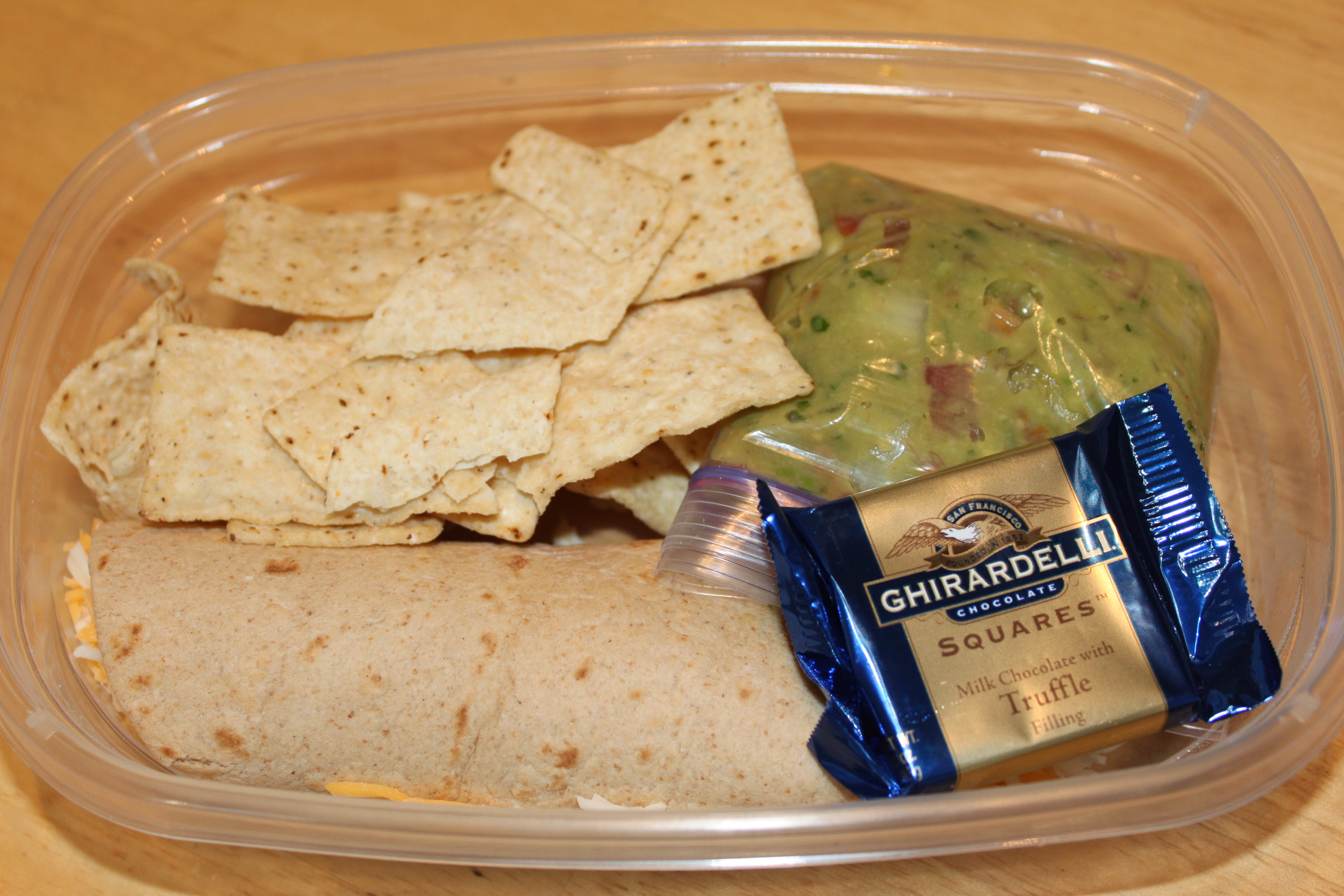 Shredded cheese wrapped in a whole grain tortilla, homemade guacamole, tortilla chips and a Ghiradelli chocolate