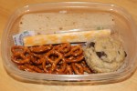 Tuna and lettuce wrapped in a whole grain tortilla, pretzels, cheese stick, banana chocolate chip muffin